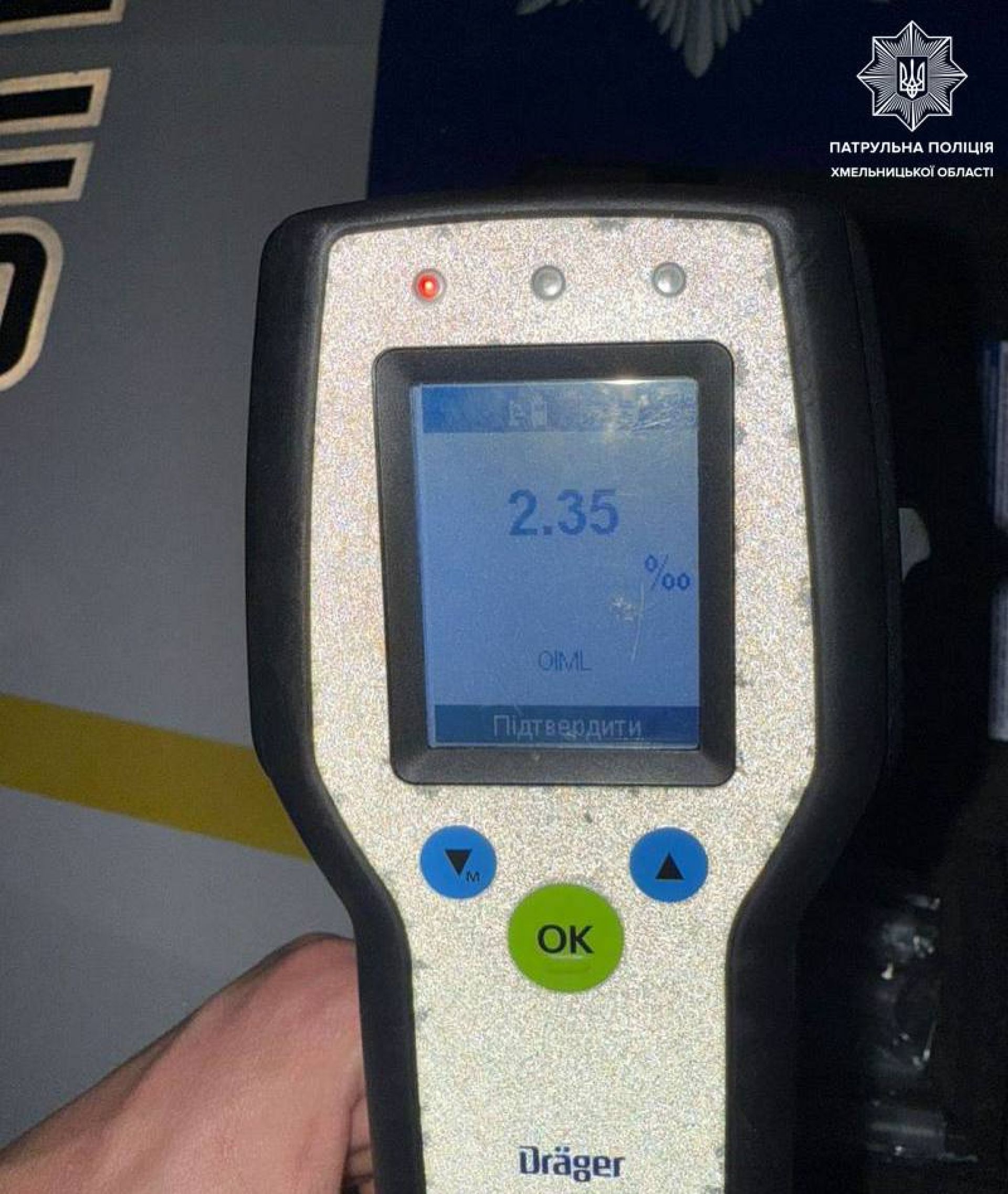 "Інспектори запропонували чоловіку пройти огляд на стан алкогольного сп'яніння у встановленому законом порядку за допомогою приладу Драгер. Результат — 2,35 проміле, що понад 11 разів перевищує допустиму норму", — йдеться у повідомленні правохооронців.