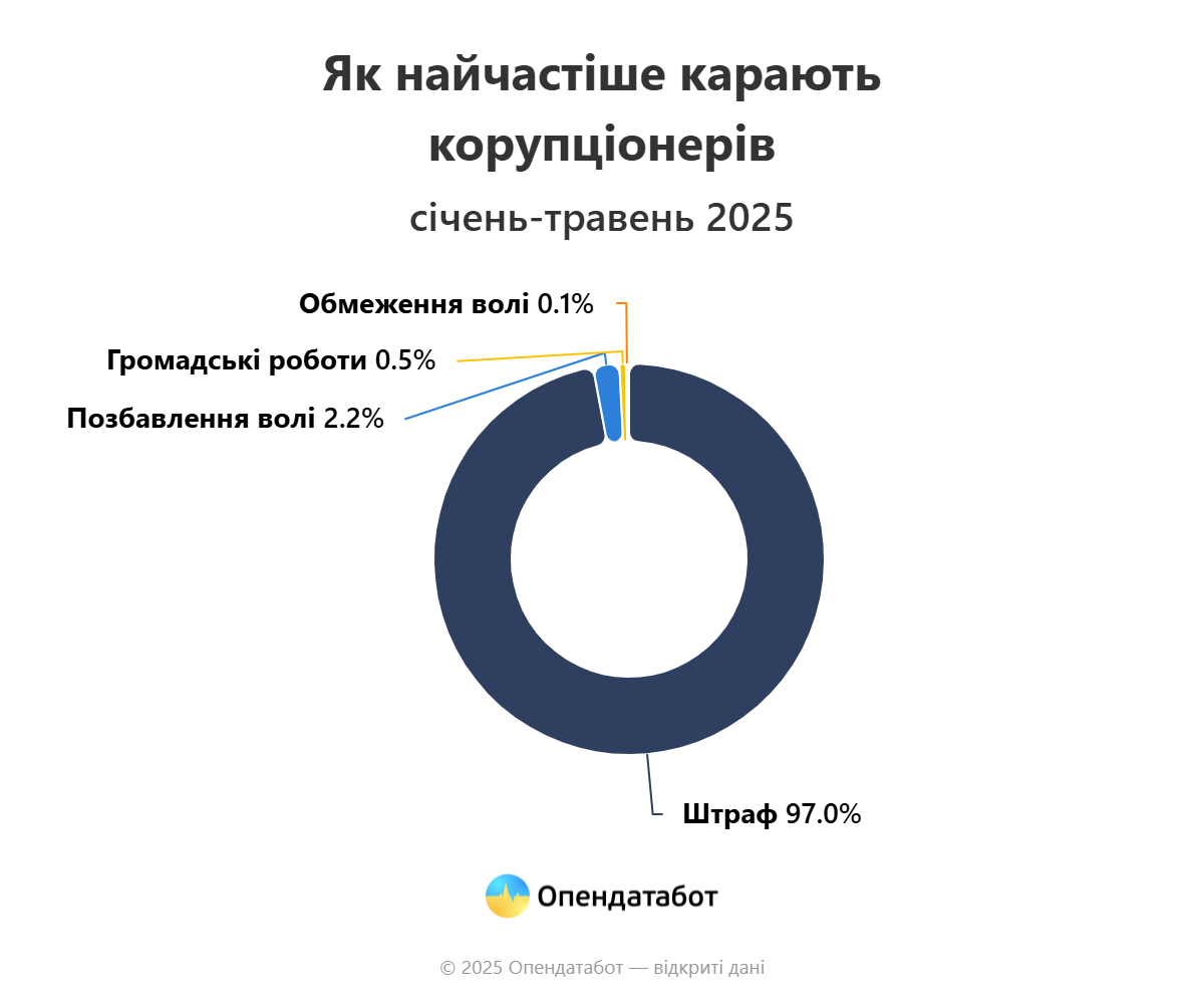 У переважній більшості випадків, а це 97%, корупціонерам призначають просто штраф. Суми штрафів коливаються від 850 грн до 680 тис. грн. Реальні терміни ув’язнення отримали лише 44 особи: від 1 до 10 років.