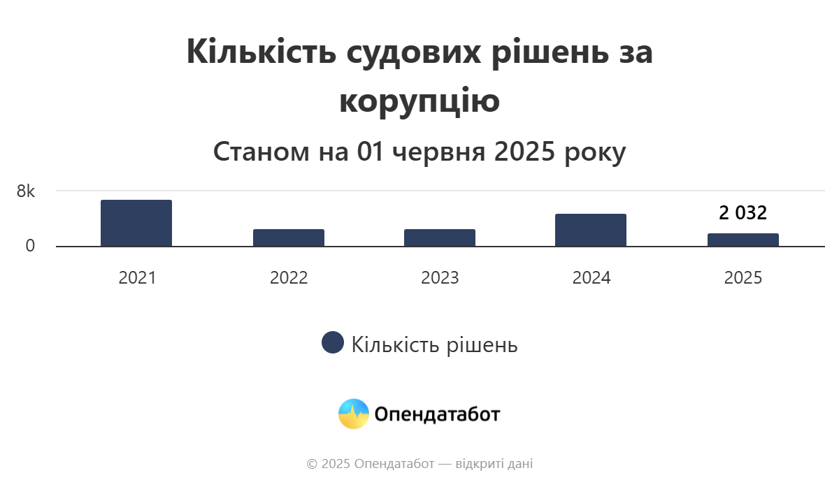 За 5 місяців поточного року суди винесли 2 032 рішення у справах за корупцію в Україні. Про це інформує Опендатабот.