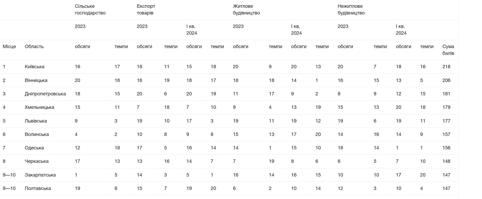 Також регіону третє місце за динамікою експорту товарів у 2023 році та шосте — за обсягами продукції сільського господарства.