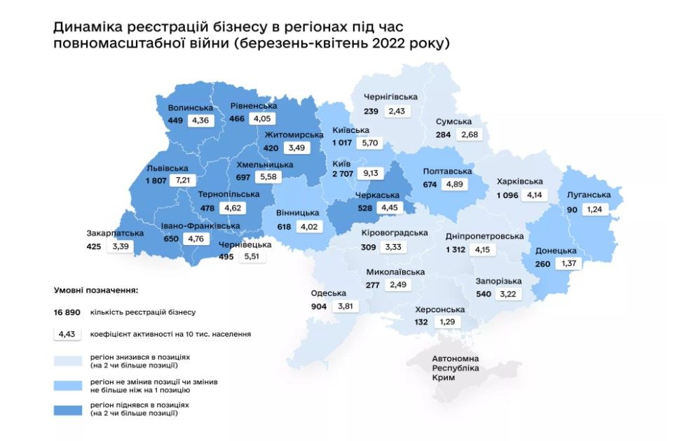 Після трьох місяців російсько-української війни в Україні пожвавилась реєстрація нового бізнесу. Водночас відбуваються істотні зміни в бізнес-привабливості територій.