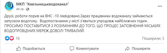 Хмельницький буде без води через аварію на Чернилівці (оновлено)