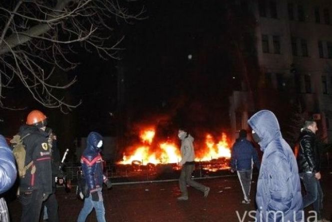 Того ж дня мітингувальники намагались виламали ворота у СБУ, а згодом підпалили вхід до будівлі. Майданівці скандували "Ганьба!". Спочатку вогонь палав здебільшого на вулиці, згодом почав палати другий поверх СБУ.
