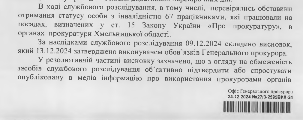 У відповіді зазначено, що розслідування не дало змоги підтвердити чи спростувати неправомірність отримання інвалідності хмельницькими прокурорами.