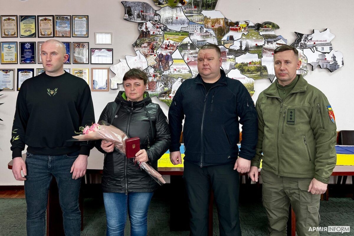 Матері захисника передали синів орден голова районної військової адміністрації Анатолій Катеренчук, міський голова Деражнянської громади Андрій Ковпак та начальник терцентру комплектування та соціальної підтримки полковник Микола Грушка.