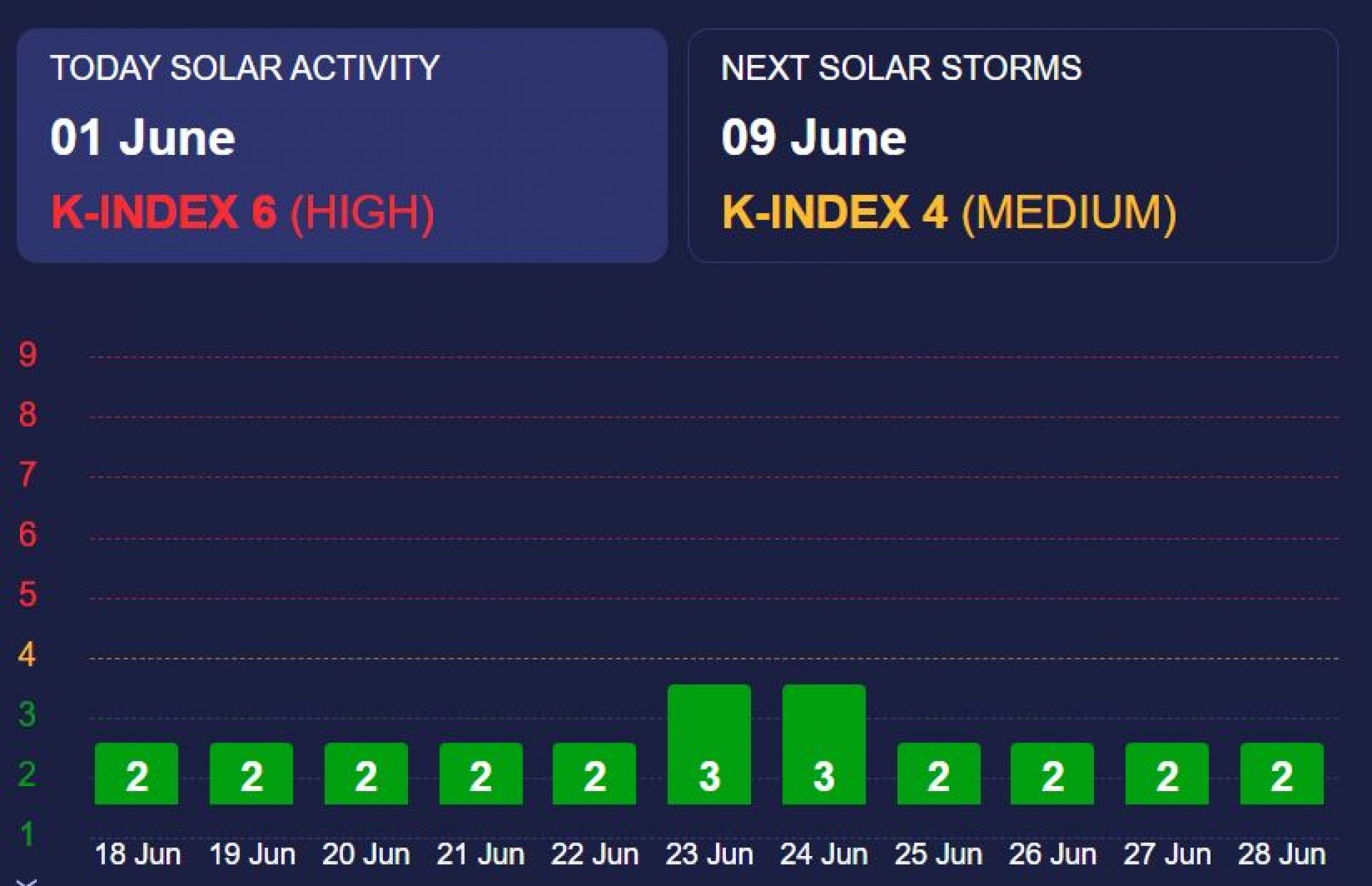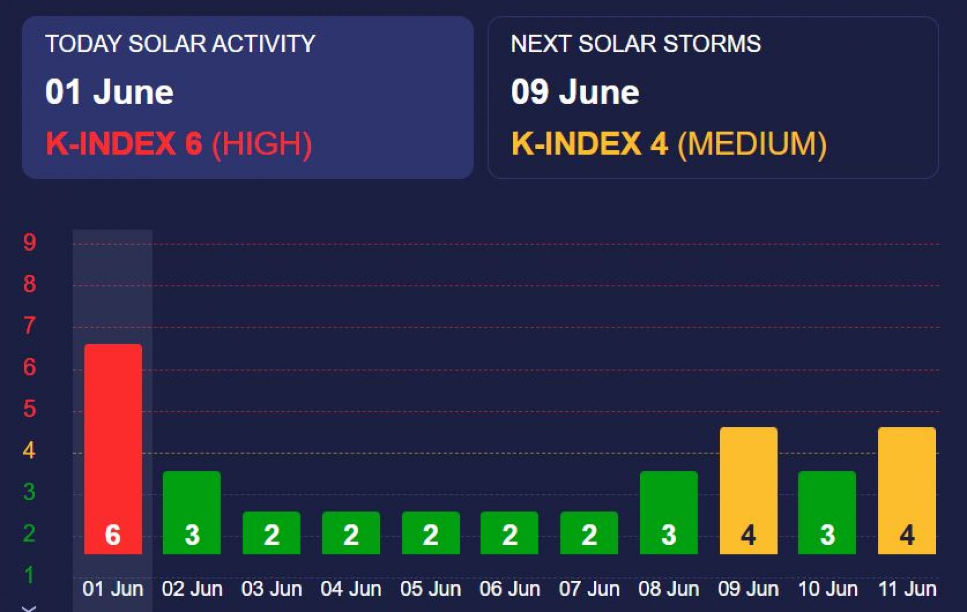 1, 4, 11, 12 та 23 червня — сильна магнітна буря,