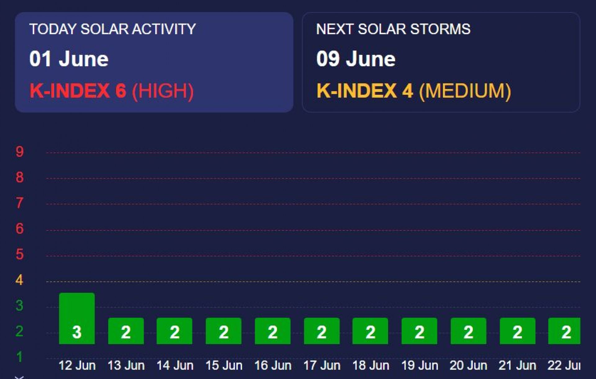 8, 10, 12, 15 та 22 червня — геомагнітна буря середньої інтенсивності,
