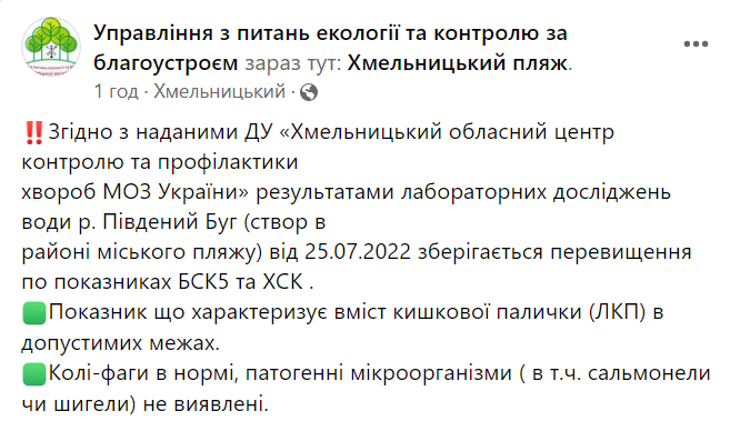 — Від 25 липня 2022 зберігається перевищення по показниках БСК5 та ХСК. Показник що характеризує вміст кишкової палички (ЛКП) в допустимих межах. Колі-фаги в нормі, патогенні мікроорганізми (в т.ч. сальмонели чи шигели) не виявлені, — заявляють в Центрі.
