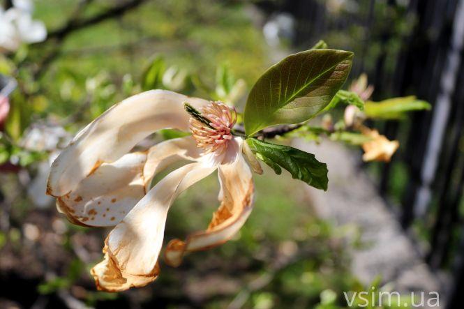 При вході на територію ХНУ висаджені в рядок магнолії, які квітнуть білим кольором. Вони вже перецвітають, але дещо завчасно. Керівниця ботанічного саду Людмила Казімірова пояснює, що наступного дня після приморозків на пелюстках з’явились коричневі й чорні плями, а згодом вони почали опадати. Загалом через затяжну зиму початок вегетативного періоду в рослин розпочався на два тижні пізніше, ніж зазвичай. Проте для інших дерев і кущів це навпаки допомогло зберегти бруньки від ушкодження приморзками.