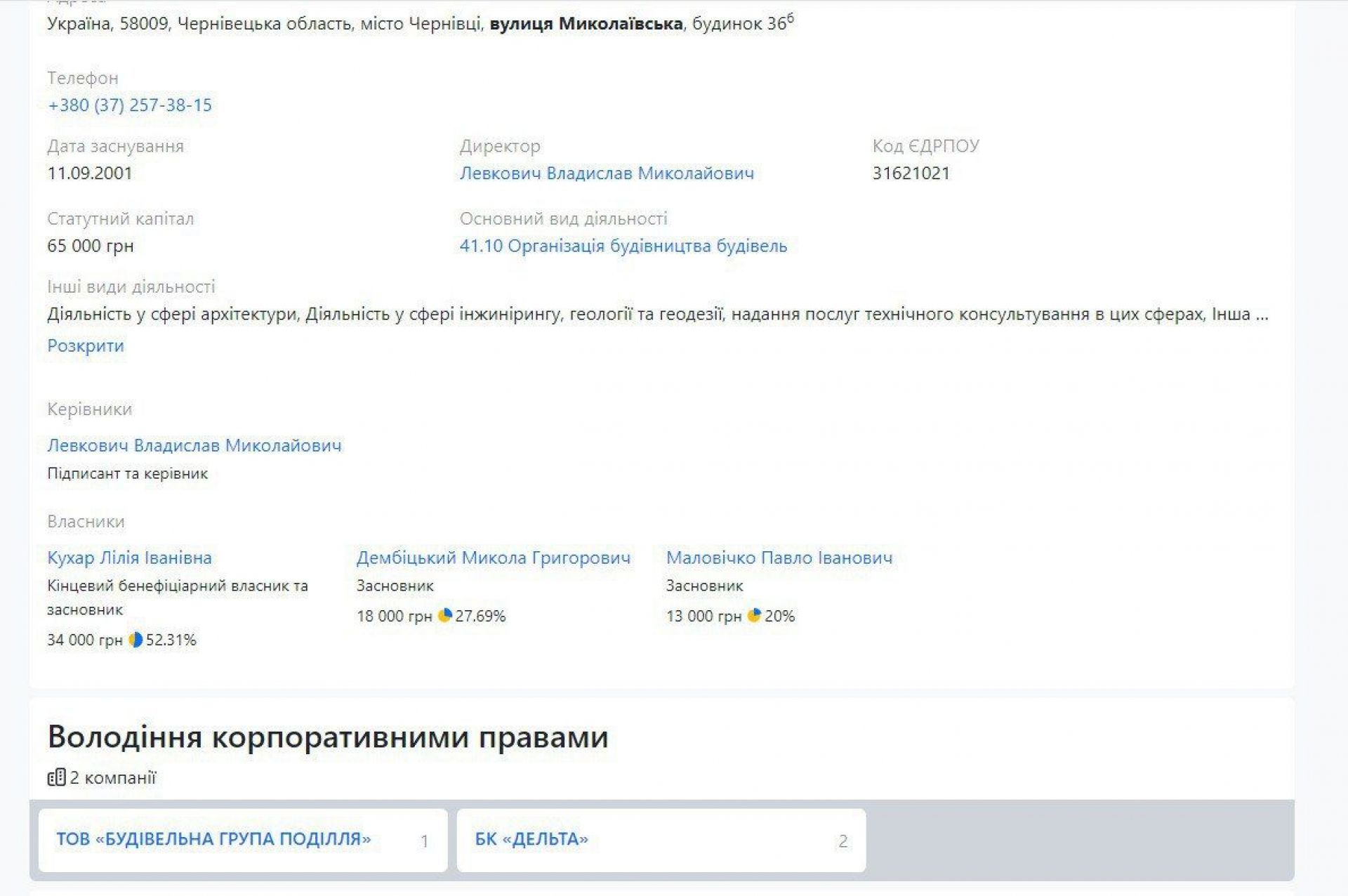 Забудовником виступає чернівецька компанія «БІТІДІ ГРУП». Директор - Павло Маловічко, який фігурує як засновник в декількох компаніях. У тому числі — «Будівельній групі Поділля», яка і зазначена в документах підрядником. Очолює її Дмитро Пилип’юк. У базі «Youcontrol» побачили, що Маловічко фігурує і в компанії «Будмонтаж-2001», яка у 2015-му виграла тендер на будівництво житлового будинку на місці казарм в Одесі. Здати в експлуатацію мали у 2017 не змогли і з ними розірвали договір.