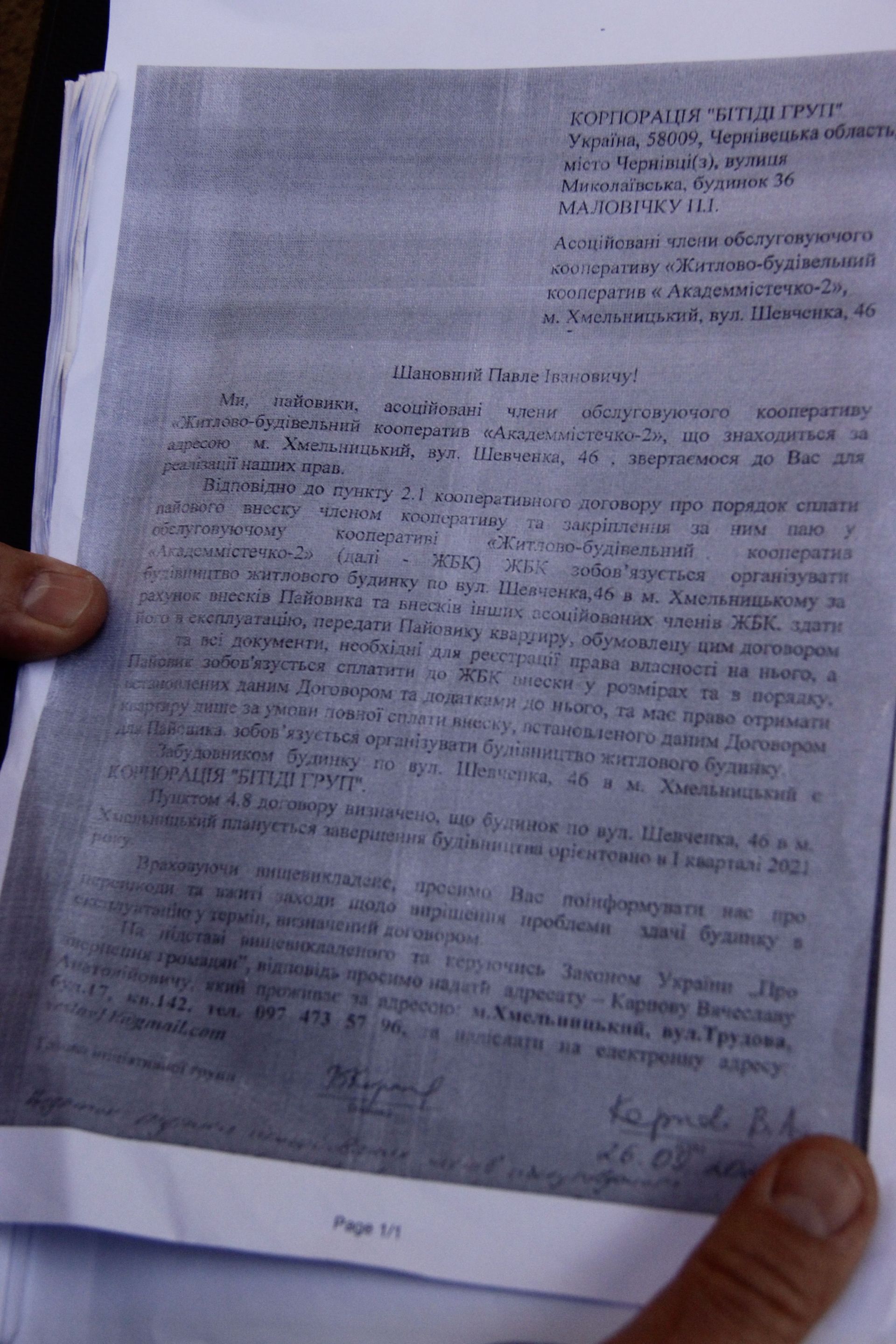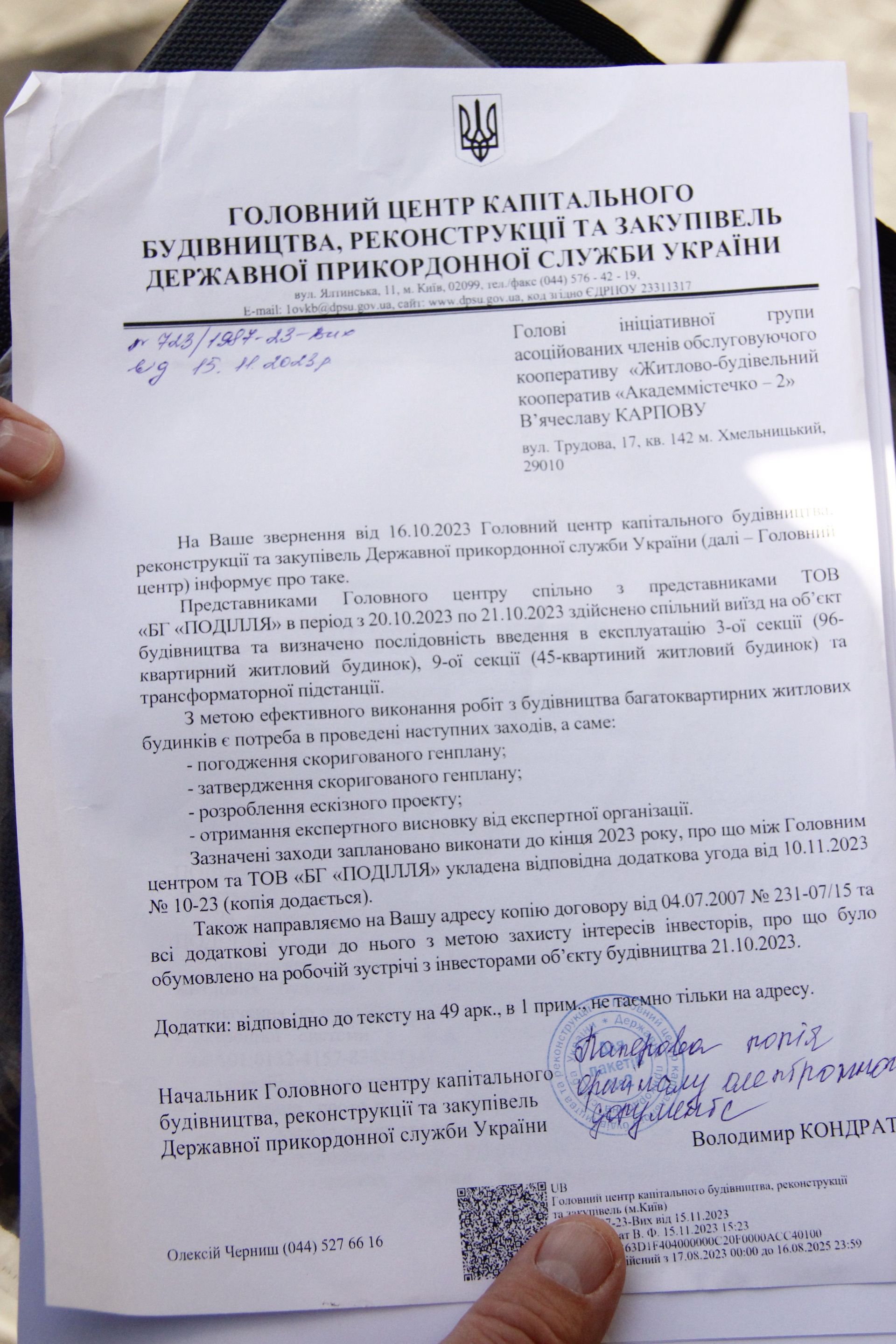 Ініціативна група інвесторів звернулася до представників Державної прикордонній академії у Хмельницькому. Їм порадили написати колективне звернення на ім’я і забудовника, і ДПСУ. У цьому випадку «прикордонка», як сторона договору, зможе просунути справу далі — подати до суду. Та це, кажуть люди, робили й раніше — досі результату немає.