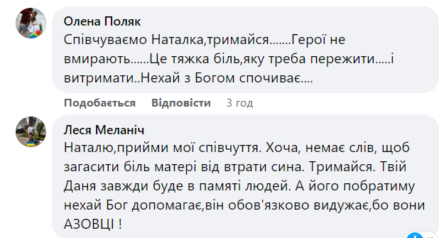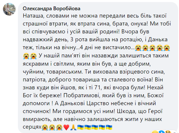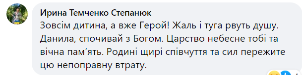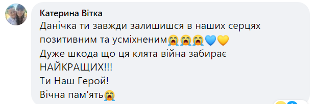 — Даніїл віддав найцінніше, що мав — своє життя за нашу свободу, за наші тихі ночі та мирні ранки! Коротке життя Данилка та його швидка і героїчна смерть — це приклад небайдужості і любові до рідного краю! Важко словами описати гіркоту втрати. Адже ніхто і ніколи уже не поверне матері сина, сестрам – брата, бабусям і дідусям — онука, військовим — побратима, а усім іншим — друга, колегу, однокласника, просто хорошу світлу людину, якою був Данилко. Лише добрий і світлий спогад назавжди залишиться у нашій пам`яті, — пишуть на сторінці Війтовецької тегромади.