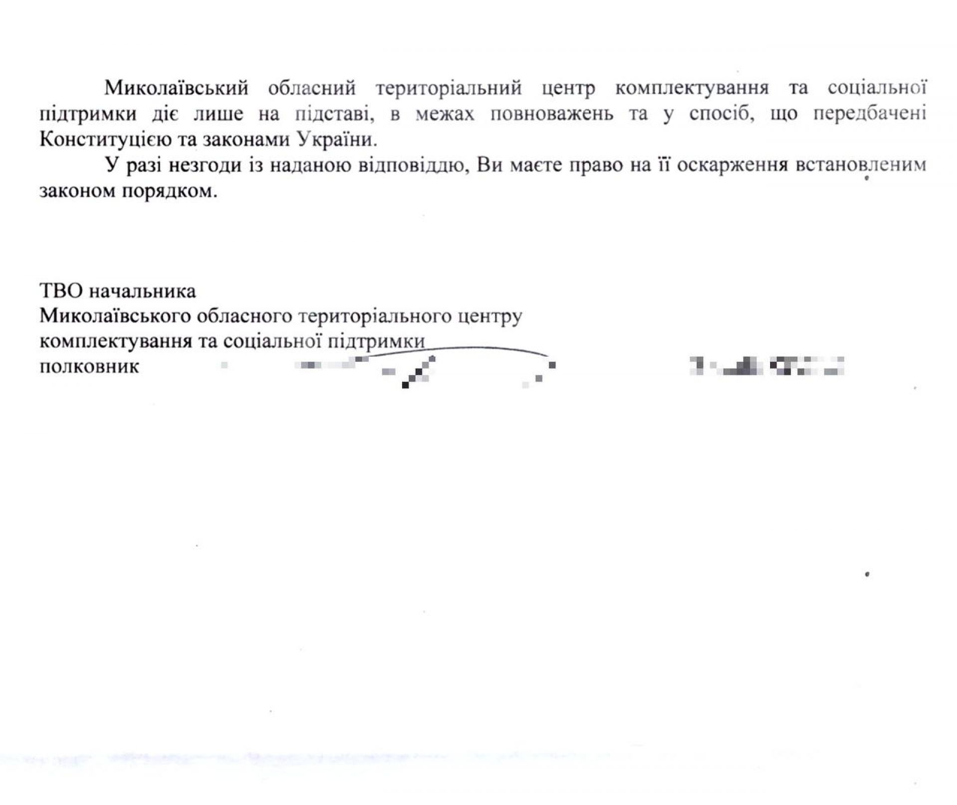 Згодом, після надання розголосу у ЗМІ, Миколаївський ТЦК дав роз’яснення щодо даного випадку. Повідомили: підприємство, на якому працював військовозобов'язаний, попередньо виконувало мобілізаційне розпорядження. По його завершенню – усі броні працівників анулювали. Однак в терцентрі не врахували те, що підприємство до того всього має статус критично важливого – це означає, що його робітники й надалі мають право на відстрочку від проходження військової служби. У своєму поясненні вони зазначили, що проводять службову перевірку по даному факту. Щоправда, про подальшу долю мобілізованого нічого не сказали.