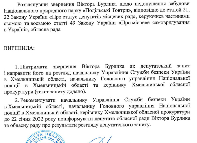 Стосовно даного факту в грудні минулого року в облраді був створений депутатський запит. У ньому йшлося про недопущення забудови Національного природного парку “Подільські товтри”. Звернення підтримали і направили на розгляд до поліції й прокуратури.