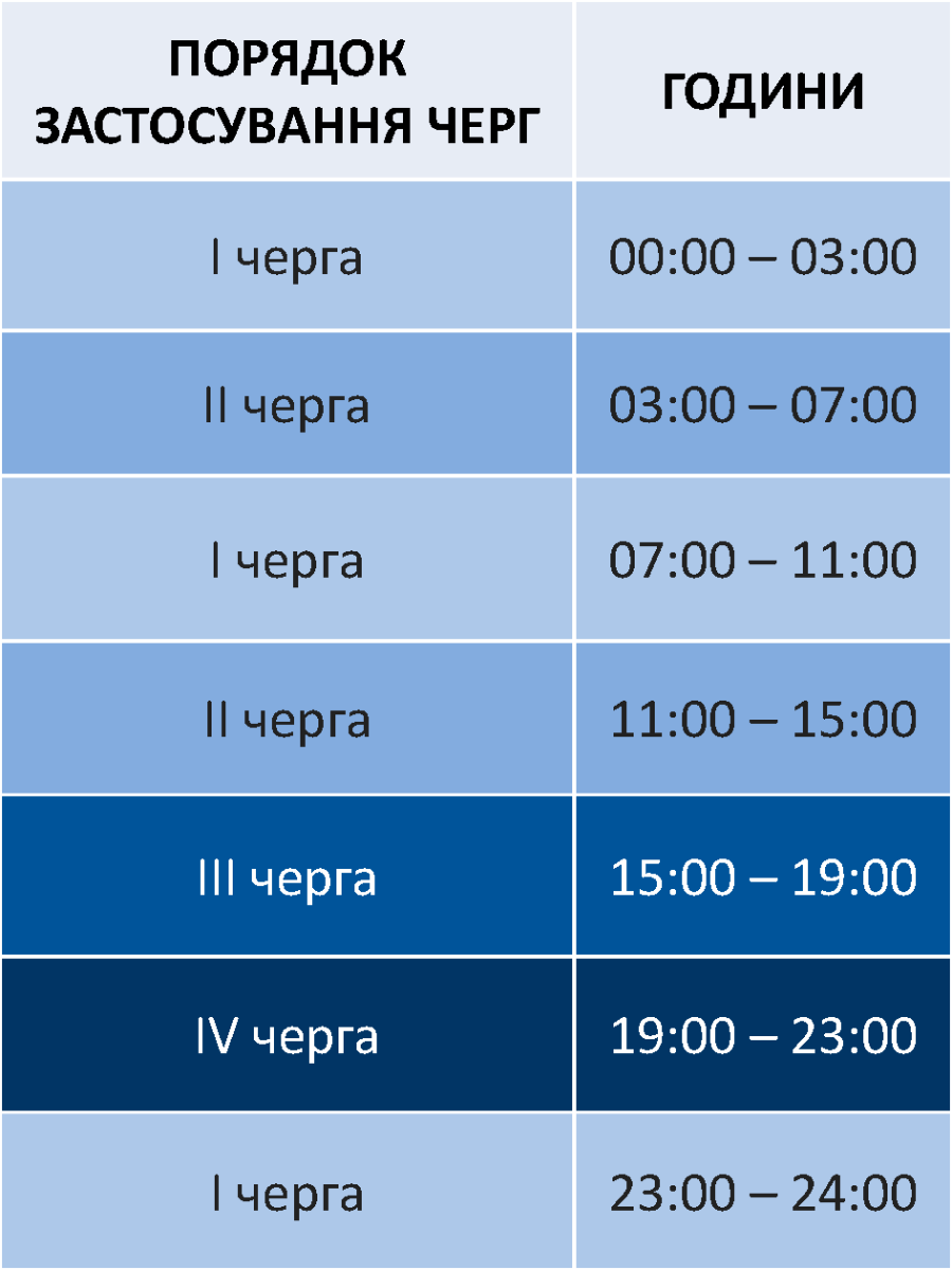 Тож, графік погодинних відключень в області застосуватиметься цілодобово, але вже не по дві черги одночасно, а по одній. Детальніше у розділі «Відключення».