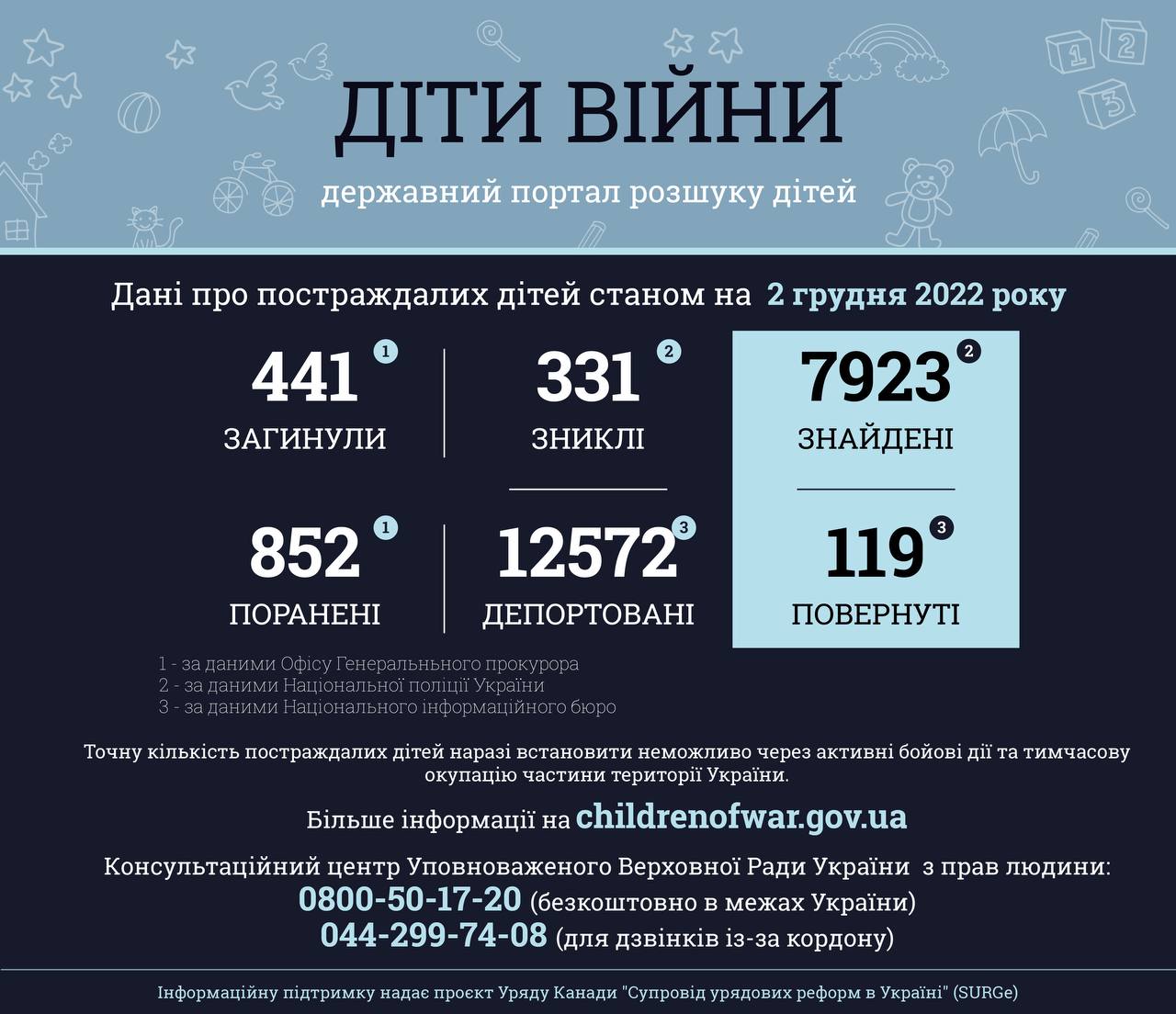 Станом на ранок 2 грудня більше, ніж 1293 дитини постраждали в Україні внаслідок повномасштабної збройної агресії російської федерації.