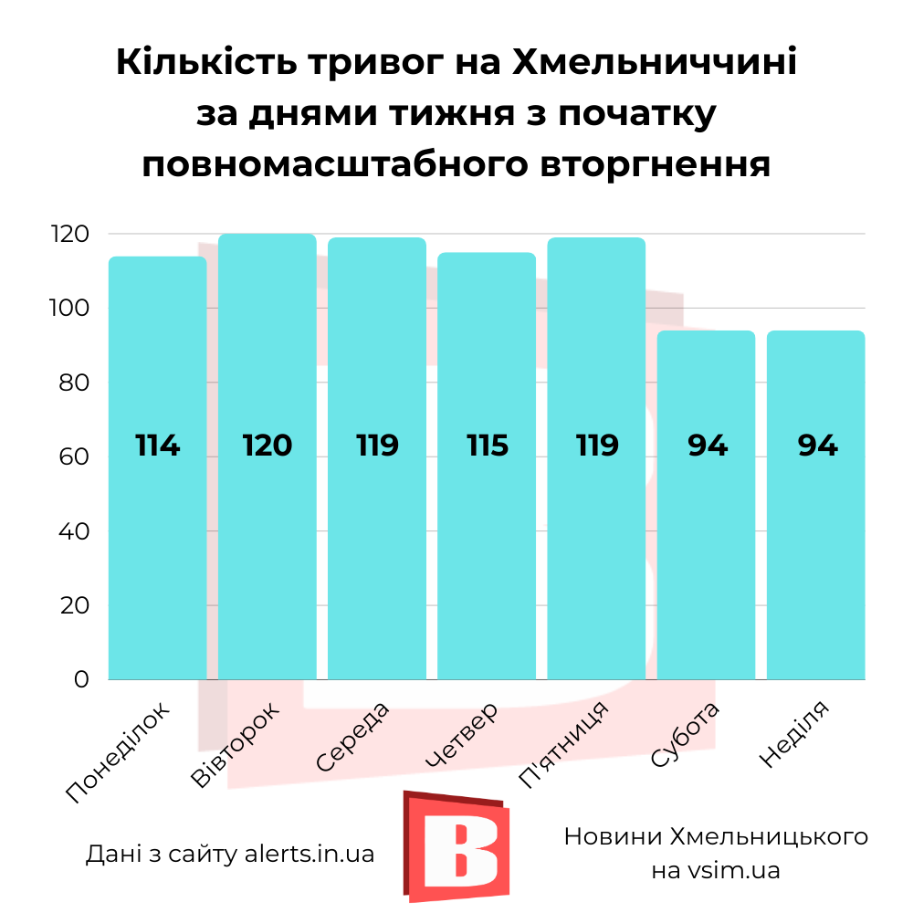 - по вихідних днях тривог менше — по 94 у суботу й неділю