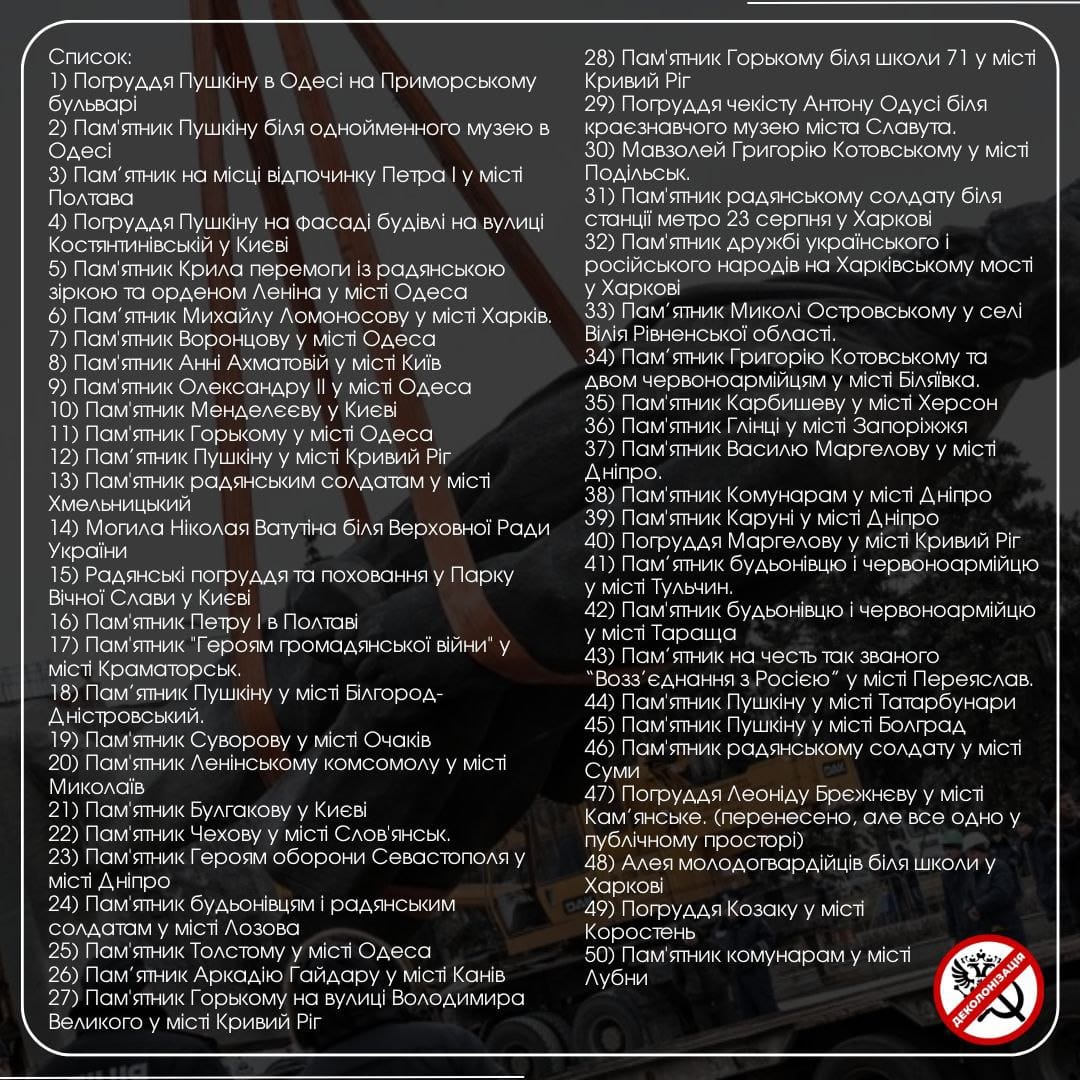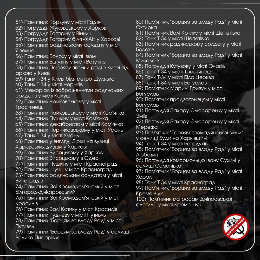 Автори проєкту підготували список “ТОП-100 пам'ятників, які треба демонтувати в рамках декомунізації/деколонізації на території України”. Чимала частина пам’яток з переліку знаходиться в Одесі. Є 6 монументів, які все ще стоять в Хмельницькій області. Це: