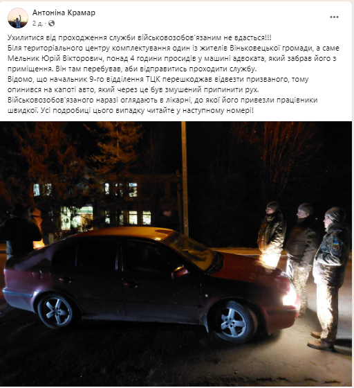 На що призовник відповідає, що приїхав до медзакладу, бо має високий тиск. Напередодні ж він проходив військово-медичну комісію в лікарні у Віньківцях, але там йому “просто печатки проставили”. Там же терапевт порадила йому звернутися до дільничного лікаря. Але військові продовжують тягти його попід руки.