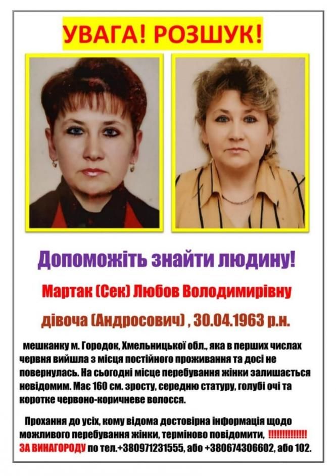 На Хмельниччині тривають пошуки зниклої жінки. Любов Мартак востаннє бачили на початку червня. Тоді вона вийшла з дому у Городку і досі її місце знаходження невідоме. Про це повідомляють на сторінці Пошуково-Рятувальної Волонтерської Асоціації.
