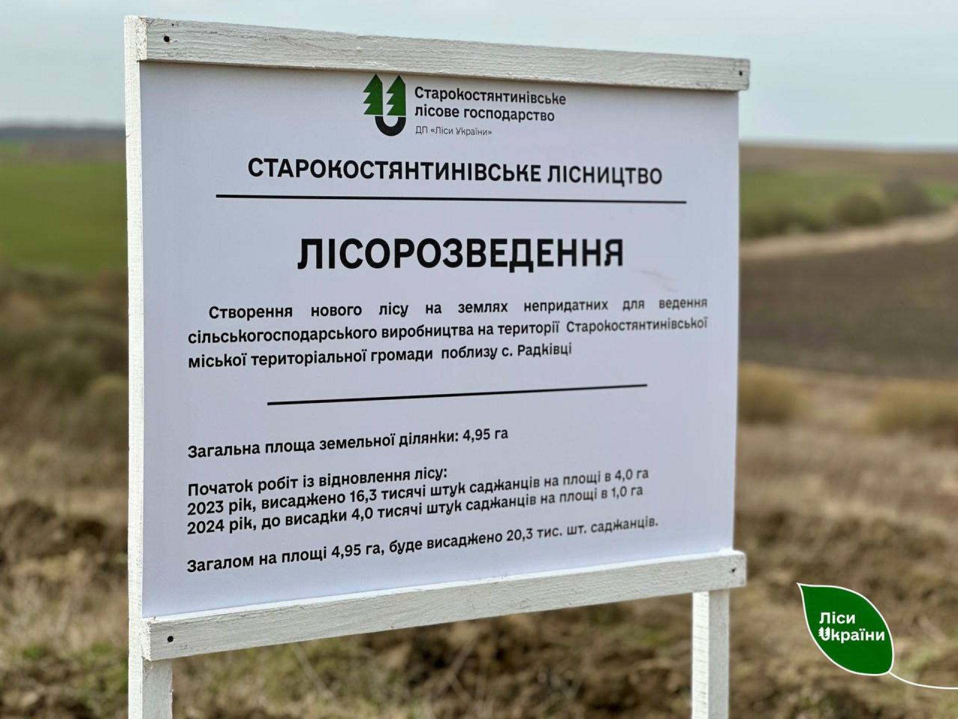 Лісівники філії «Старокостянтинівське лісове господарство» ДП «Ліси України» створили новий ліс. Його площа майже 5 гектарів. Висадили молоді деревця на землях, які минулого року передала лісовому фонду Старокостянтинівська громада.