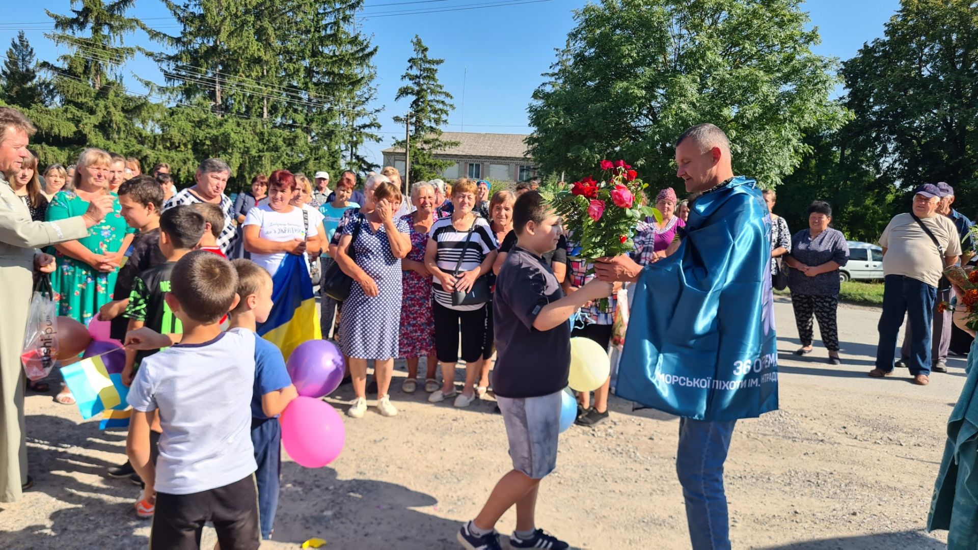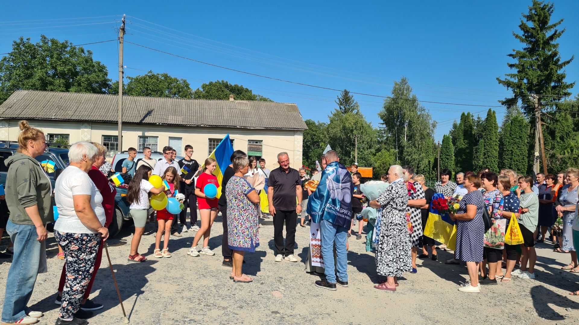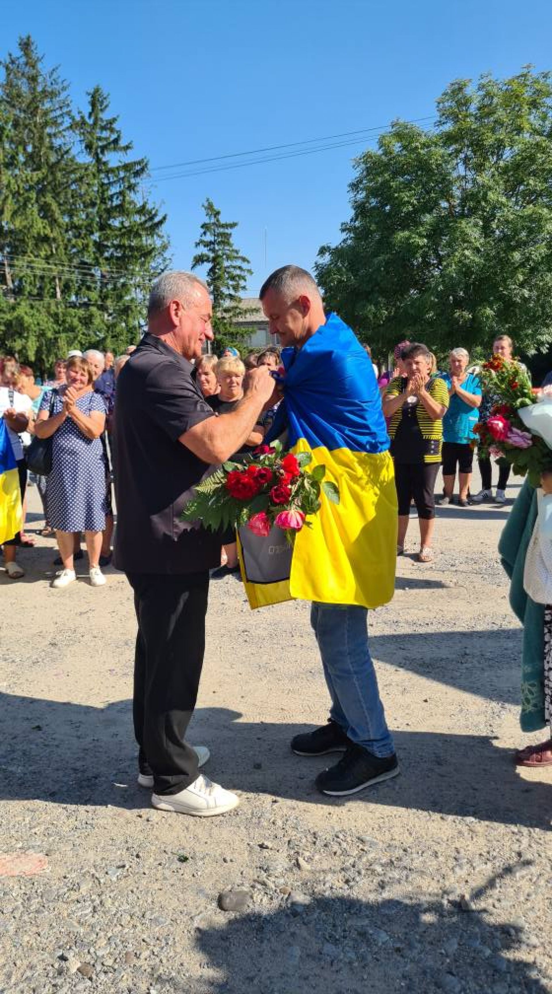 Мама, родина, сусіди, земляки прийшли у центр села, щоб привітати Івана Дмитровича з поверненням додому та обійняти його після довгої нестерпної розлуки. Присутні дякували військовослужбовцю за захист, витримку, мужність та незламність.