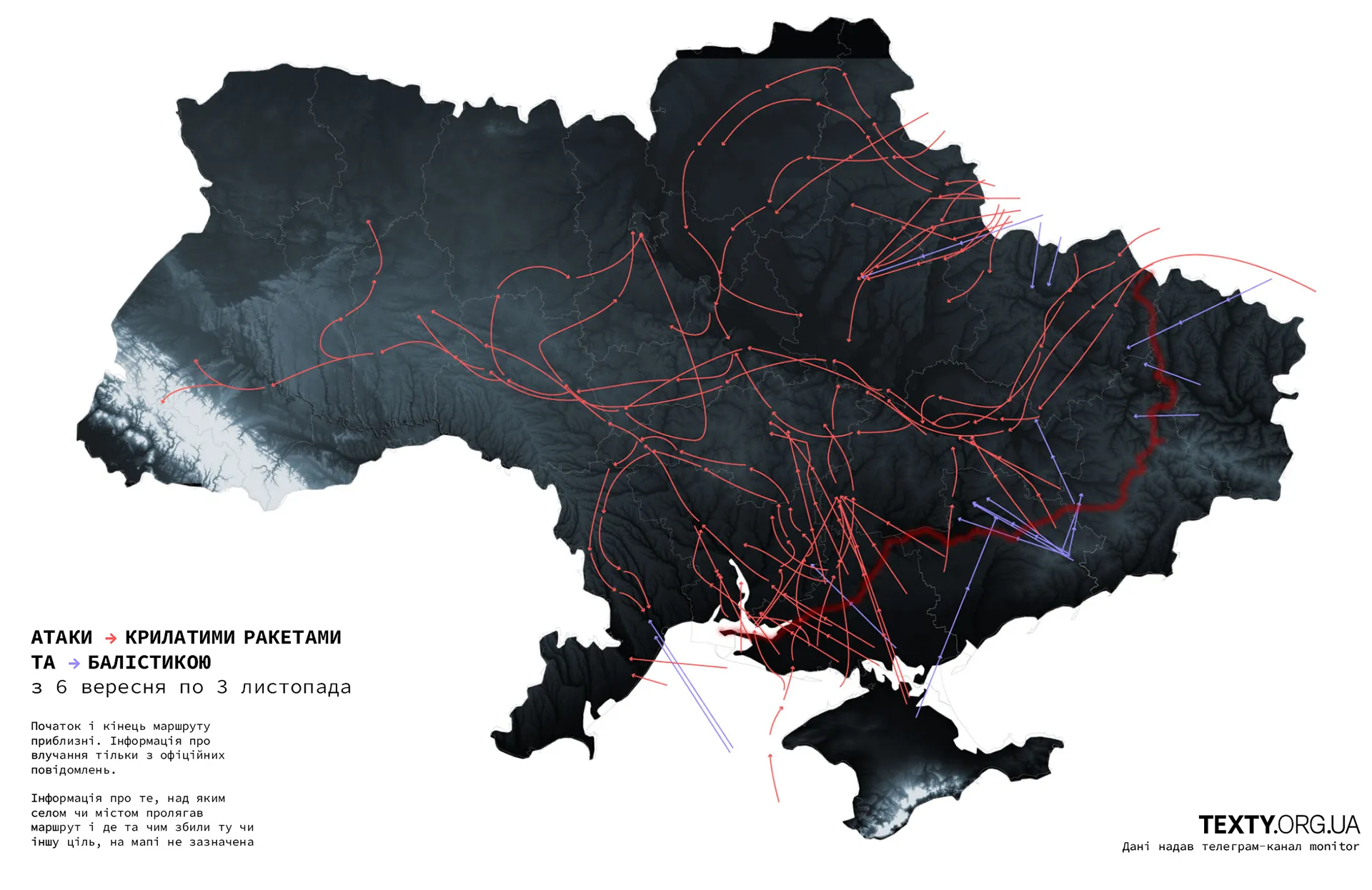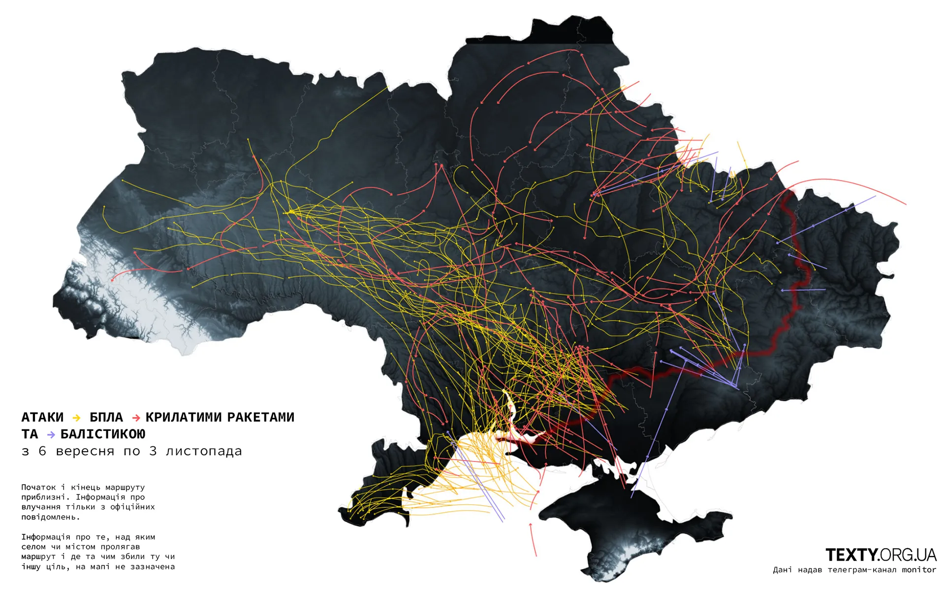 Нагадаємо, ще влітку речник Повітряних сил Юрій Ігнат повідомляв, що «шахеди» долітають до Заходу руслами річок, дорогами та межами областей. Таким чином вони проходять із Півдня. Згідно аналізу чимало їх летить із Криму. А от крилаті ракети типу Х зазвичай запускаються з літаків і летять по прямій. Балістичні ракети різко набирають висоту, потім падають на ціль, на карті це показано як пряма лінія.