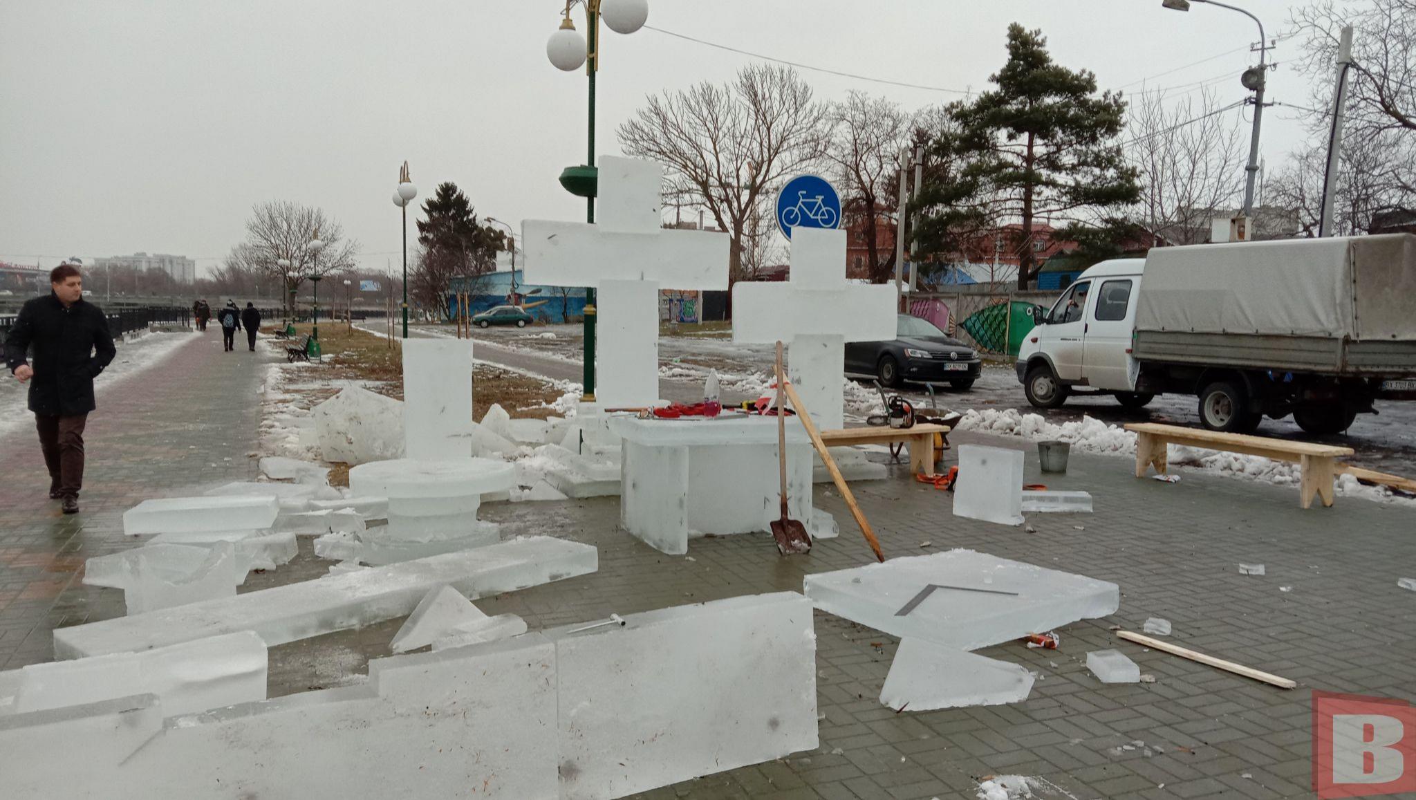 На набережній Південного Бугу у Хмельницькому з’явилися три композиції з крижаних скульптур. Перша з них — це напис «Я ❤️ Хмельницький», друга — напис «Слава Україні» з тризубом та ялинками, третя — три хрести та стіл з чашею. Остання ще не завершена, над нею продовжують працювати майстри. Лід для скульптур брали з Південного Бугу.