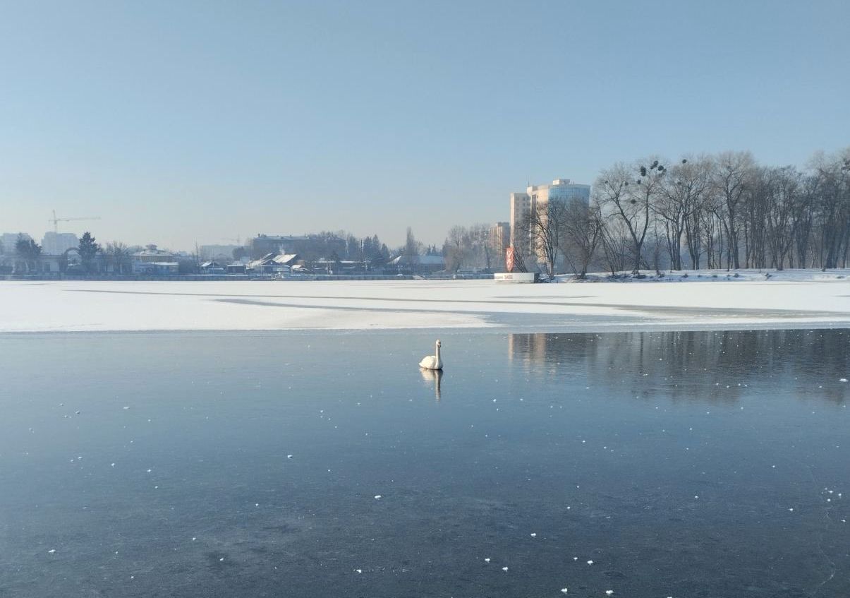 У четвер, 9 лютого, працівники комунального підприємства "Парки і сквери міста Хмельницького" помітили посеред Південного Бугу білого лебедя.