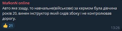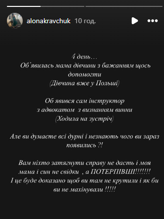 – 18.09.2024 року на Озерній, було збито мою маму і сина. Перша машина зупинилась, машина , що позаду це навчальна машина погранничної академії @nadpsu в якій за кермом була 17-річна курсантка. Вона «переплутала»педалі, а інструктор збоку «тормозив» але чомусь в нього не «спрацювали»тормоза, – зазначила жінка у своєму дописі.В результаті цієї дорожньо-транспортної пригоди у матері Альони – перелом, наклали гіпс. Також забій спини. У її сина – струс головного мозку. Вони на стаціонарному лікуванні. Жінка продовжила: одразу після аварії, цитуємо, «понаїжджало чоловік 20 «моральна підтримка» інструктора»», – написала у соцмережах хмельничанка. 21 вересня Альона повідомила: з нею зв'язалася матір дівчини, яка була за кермом. Хоча сама кермувальниця, за словами жінки, уже за кордоном. Прийшов також інструктор із адвокатом.