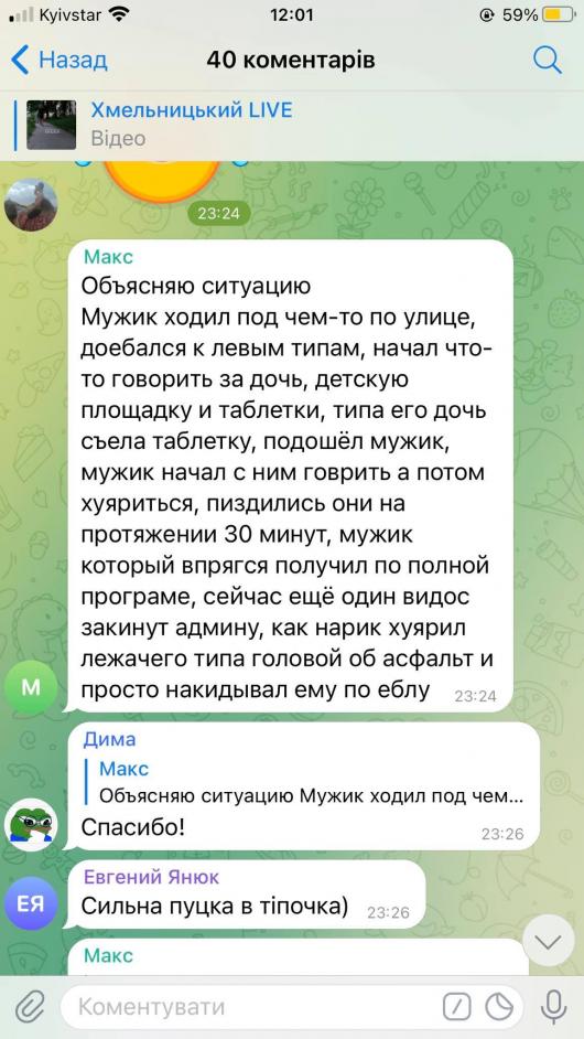 «Мужик ходил под чем-то по улице, до***лся к левым типам, начал что-то говорить за дочь, детскую площадку и таблетки, типа его дочь сьела таблетку, подошел мужик, начал с ним говорить…Мужик который впрягся, получил по полной програме», - написав користувач.