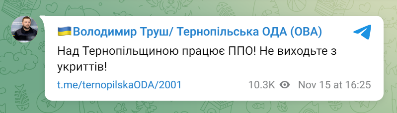 Голова Тернопільської обласної військової адміністрації повідомив, що над областю також працює ППО: