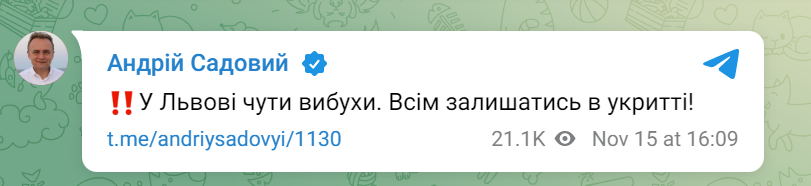 Згодом стало відомо про вибухи у Львові. Про це зазначив мер міста Андрій Садовий: