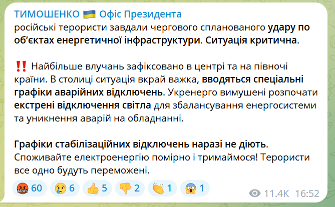 В Офісі Президента повідомили, що сьогодні по всій країні можливі аварійні відключення світла через удари по критичній інфракструктурі.