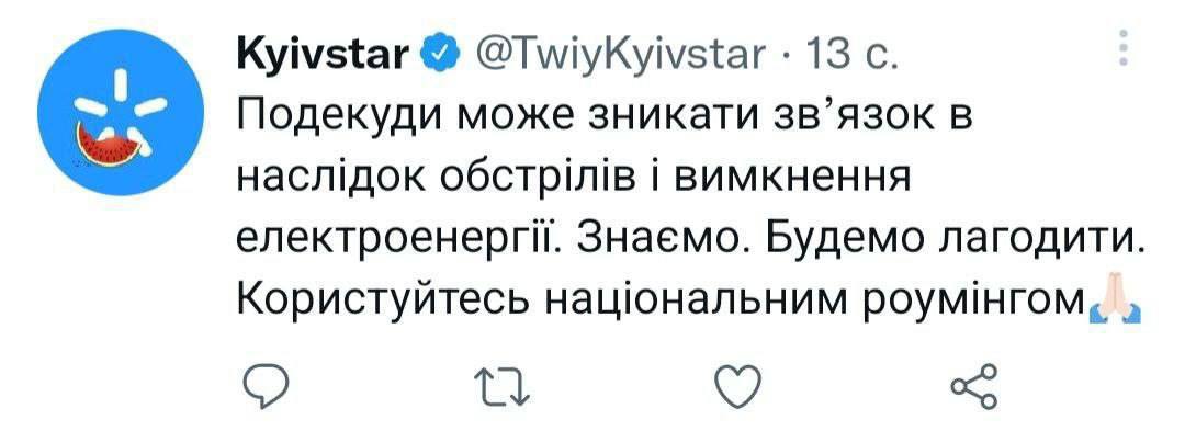 Оператор мобільного зв'язку "Київстар" також попередив, що подекуди може зникати мережа: