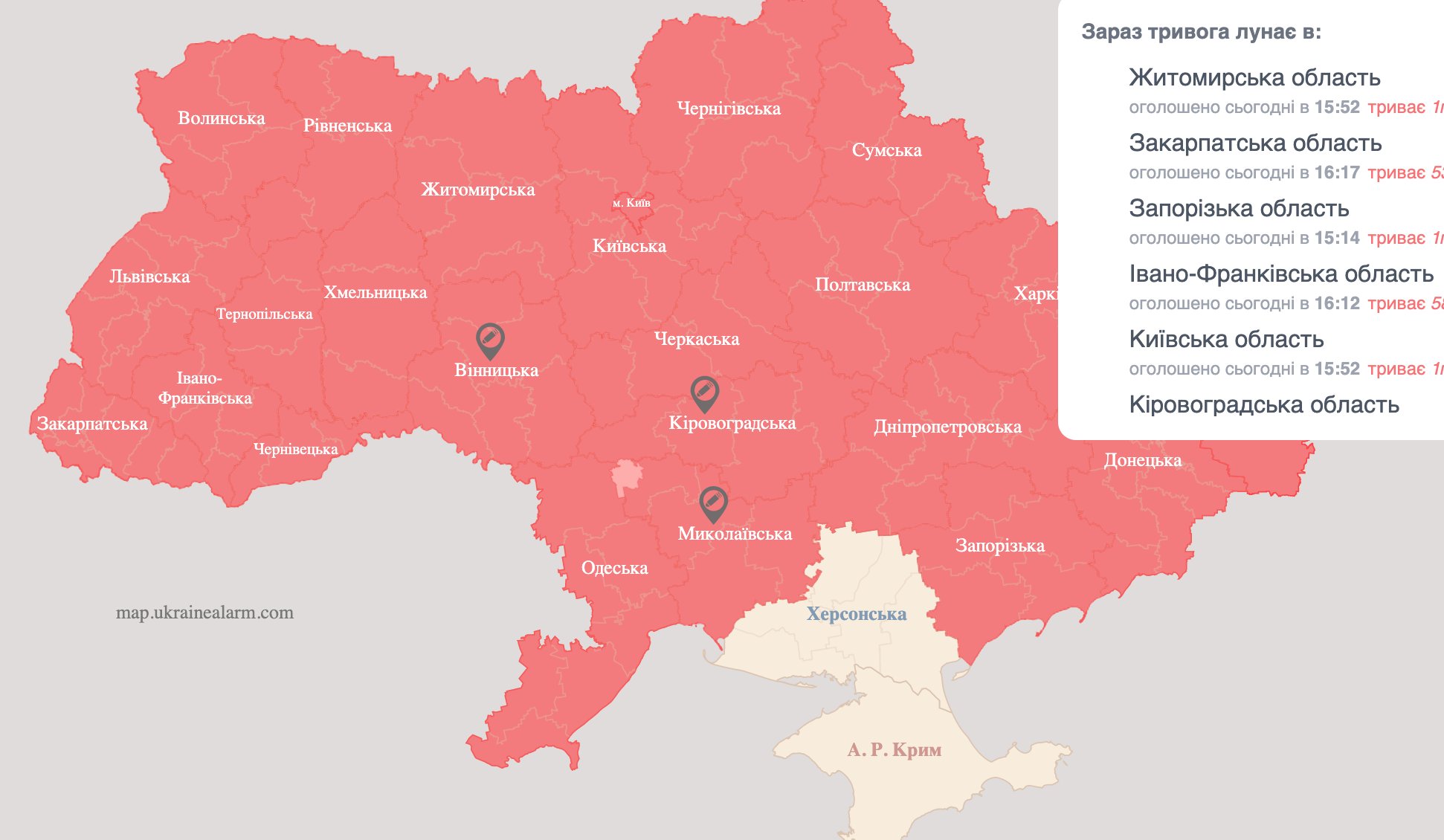 - Повітряна тривога була оголошена по всій Україні, окрім Херсонщини.