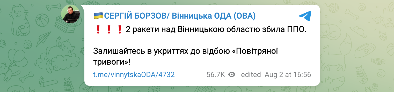 Над Вінниччиною збили дві ворожі ракети, – Сергій Борзов (ОНОВЛЕНО)