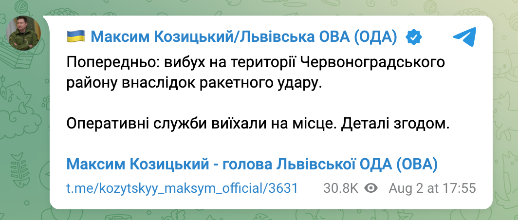 Голова Львівської ОДА Максим Козицький повідомив про вибух на території Червоноградського району внаслідок ракетного удару.