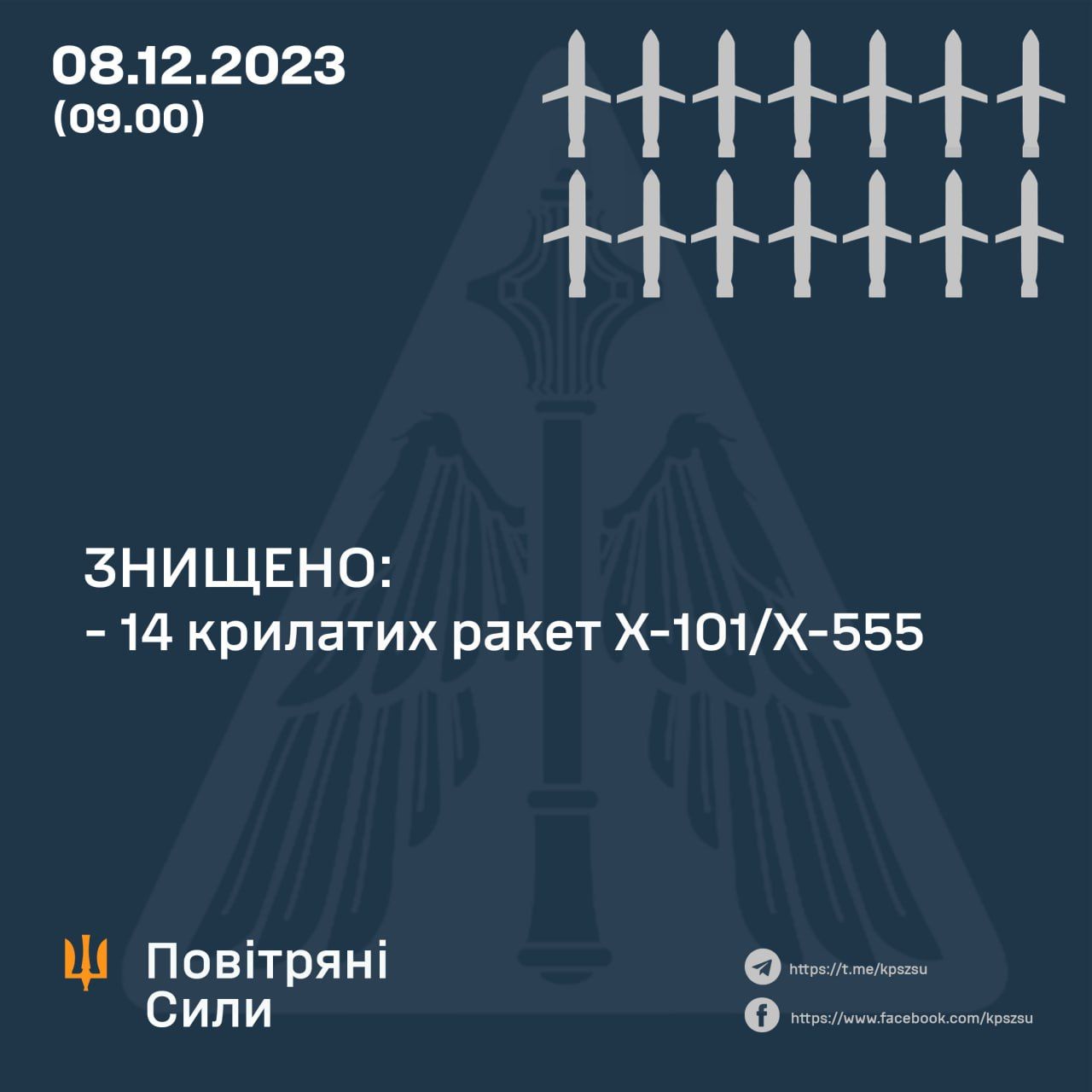 Вранці сьогодні, 8 грудня, в більшості областей України була оголошена повітряна тривога. Все через пуски крилатих ракет 101 Х-555 з літаків стратегічної авіації Ту-95. 19 крилатих ракет було запущено Із них було збито 14. Про це повідомили в Повітряних силах ЗСУ, Додамо, що востаннє росіяни застосовували крилаті ракети 79 днів тому.