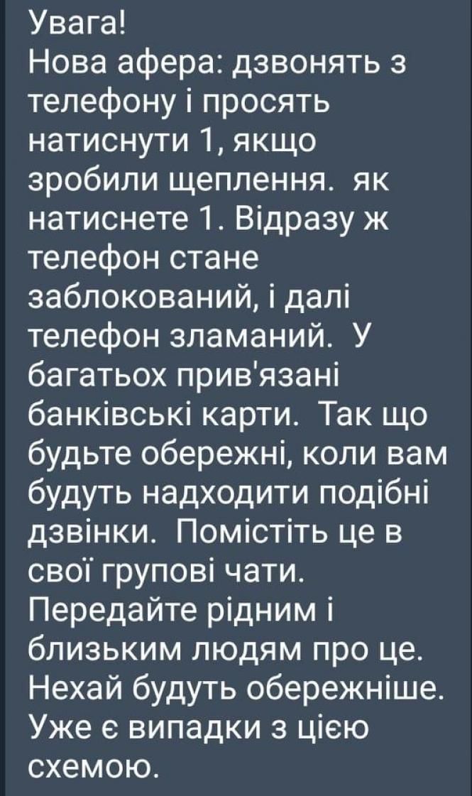 Натисніть «1», якщо зробили щеплення. Після натискання потрібної цифри, телефон блокують або зламують. Інформація з таким текстом нещодавно почала поширюватись в мережі, її активно підхопили користувачі, зокрема у Фейсбук.