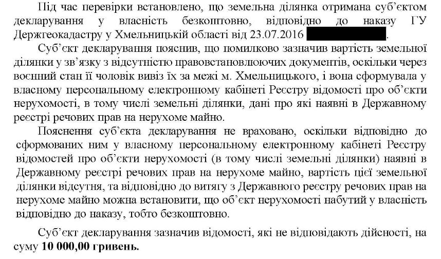 За місяць до обшуків, НАЗК завершило перевірку декларації за 2023 рік тодішньої голови Хмельницької обласної МСЕК Тетяни Крупи. Зазначені нею відомості відрізнялися від правдивих на 356 398 гривень, – йдеться у висновку Нацагентства.