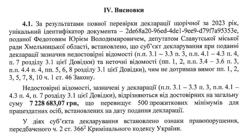 Недостовірних відомостей на 7 228 683 грн виявило НАЗК у декларації за 2023 рік в ексдепутата Славутської міської ради Юрія Федотова. Свої повноваження він склав 31 травня 2024-го.