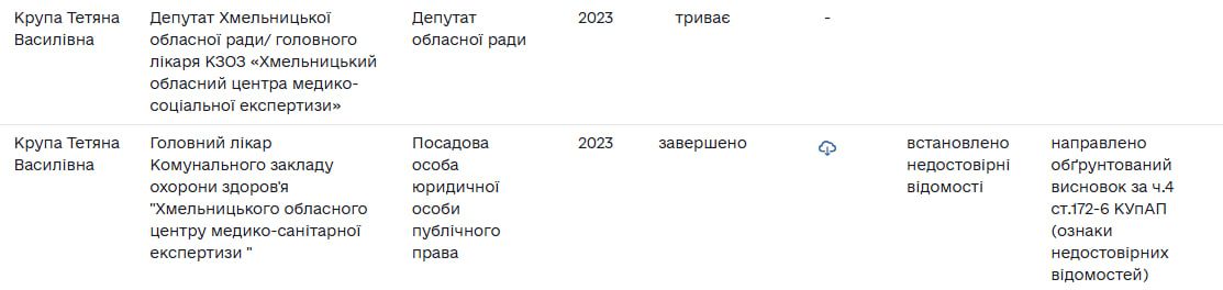 Зауважимо, НАЗК завершило перевірку декларації Крупи, як голови МСЕК, однак все ще триває аналіз її декларації, як депутатки Хмельницької обласної ради.