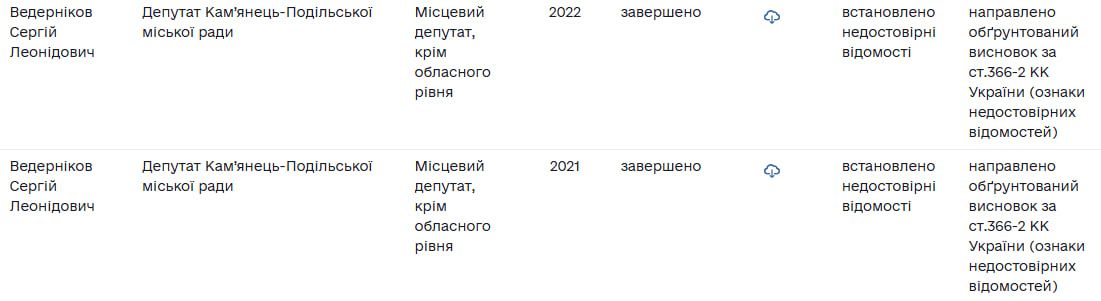 У депутата Кам’янець-Подільської міської ради НАЗК виявило найбільші суми недостовірних відомостей. Лише за 2021 рік це понад 253 мільйони гривень. А у декларації за 2022 рік – понад 252 мільйони гривень. Національна поліція України уже розпочала кримінальне провадження. Відповідно до наданих НАЗК даних, мова йде про Сергія Ведернікова.