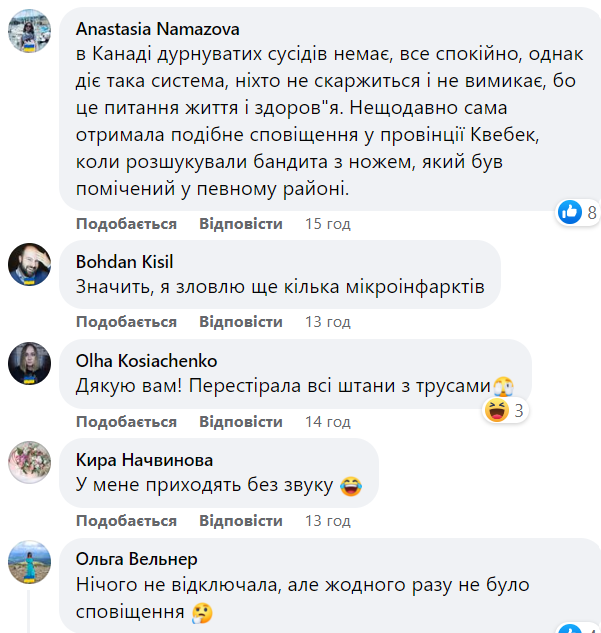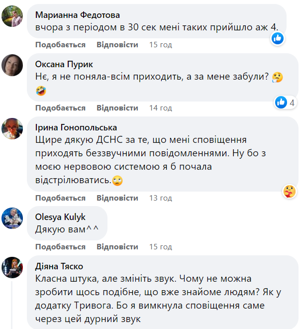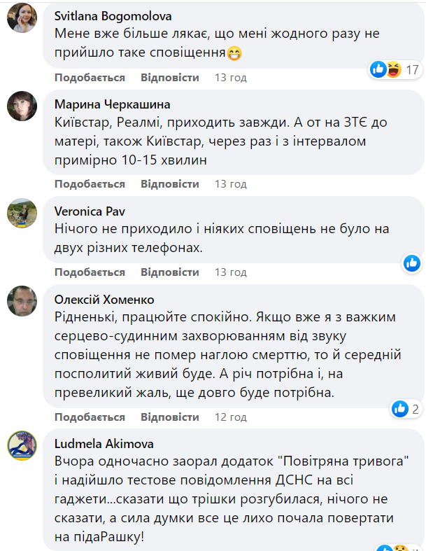 Користувачі соцмереж загалом позитивно сприйняли новину надзвичайників. Хтось жартує про переляк, хтось бідкається, що оповіщень замало чи забагато, а дехто вже переживає якщо ті не приходять: