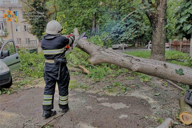 Ввечері на Хмельниччині вкотре вирувала негода – подекуди пронеслись дощі з грозами, через сильний вітер повалило дерева. Вчора, 30 червня, у центрі Кам’янця-Подільського дерево впало на легковий автомобіль «Opel Combo». Про це повідомили у Державній службі з надзвичайних ситуацій у Хмельницькій області.