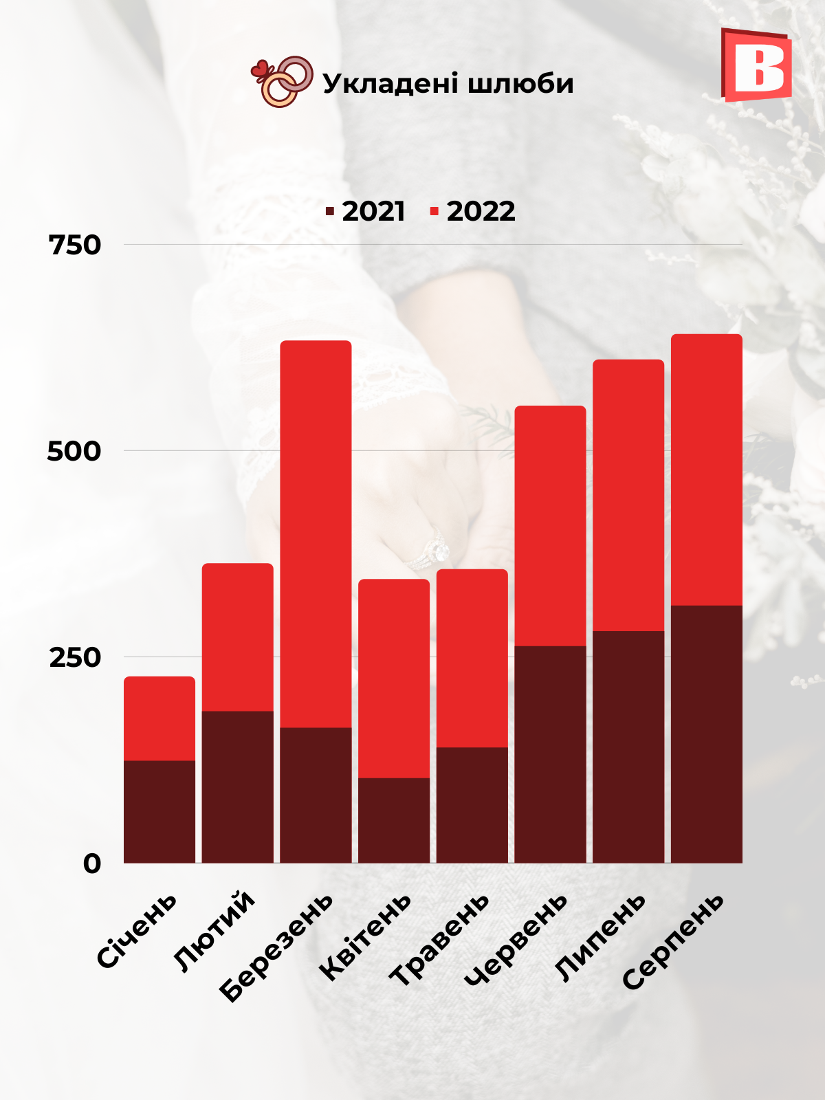 Вперше за сім останніх років в Україні зафіксували рекордну кількість укладених шлюбів. За перше півріччя стосунки узаконили 103 903 пари. Це на 21% більше, ніж за цей самий період минулоріч. Крім того, кількість розлучень в Україні знизилася майже вдвічі. За перше півріччя 2022-го в шлюб розірвали 7 632 пари, тоді як минулого року їх було 13 153.