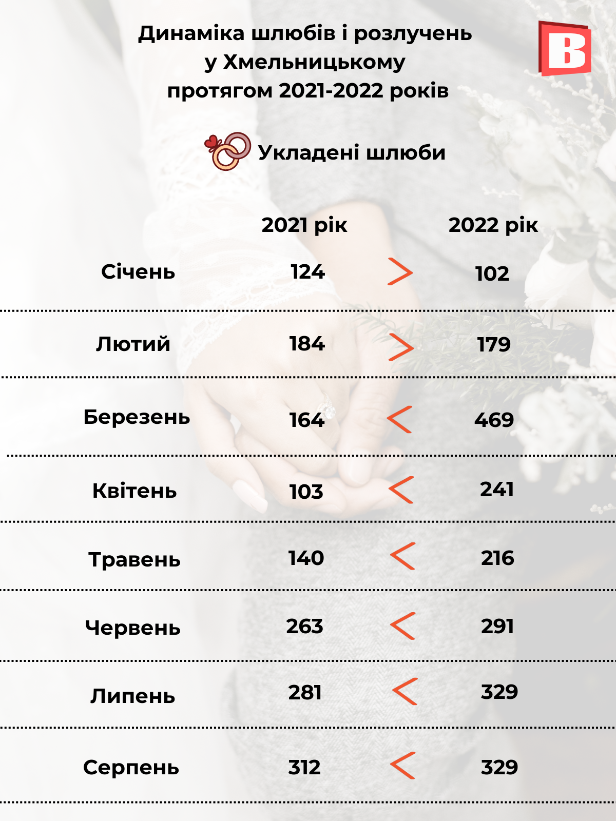 Яка ситуація у Хмельницькому? Журналістка vsim.ua звернулася за даними до Центрально-Західного міжрегіонального управління Міністерства юстиції. Загальна кількість шлюбів за 2021 рік склала 2 389. Тоді, як цього року за 8 місяців вже побралися 2 156 пар.