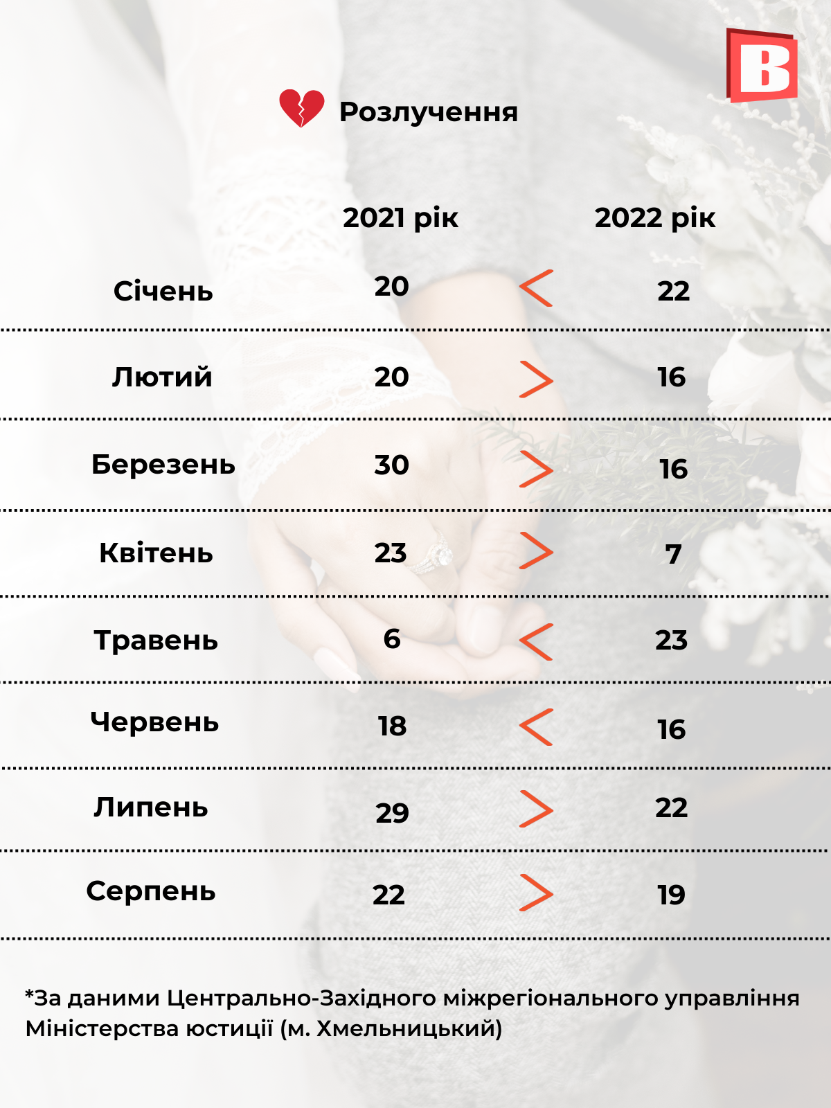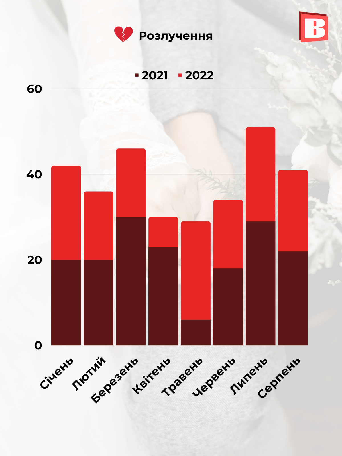 За минулий рік шлюб розірвали 262 подружжів. А за січень-серпень цього року - 141. Спостерігається тенденція до зменшення кількості розлучень. Зокрема - минулоріч в середньому щомісяця розлучалася 21 пара. Натомість цього року - 17. Проте слід зауважити, що пік розлучень може припасти на кінець року. Оскільки так було торік.