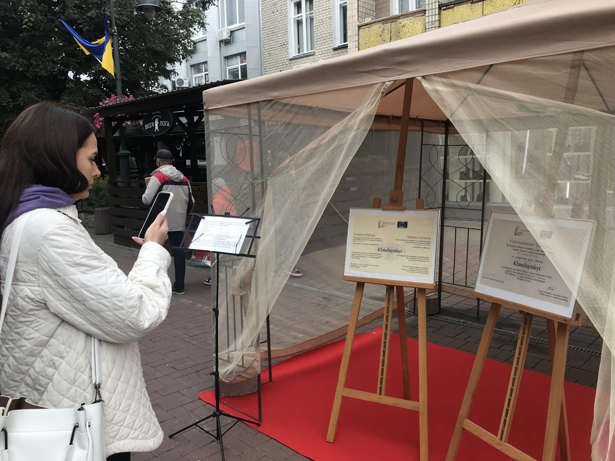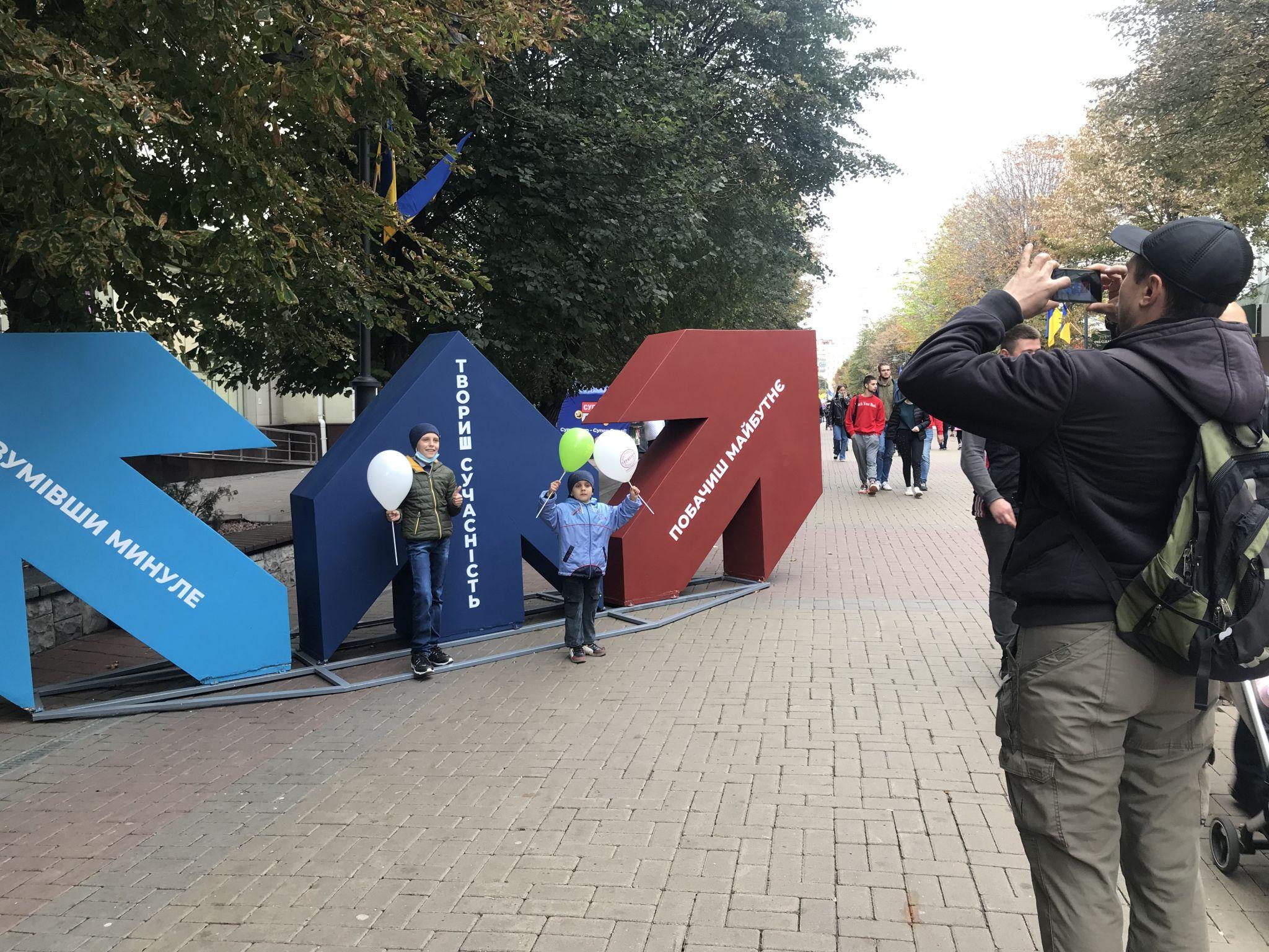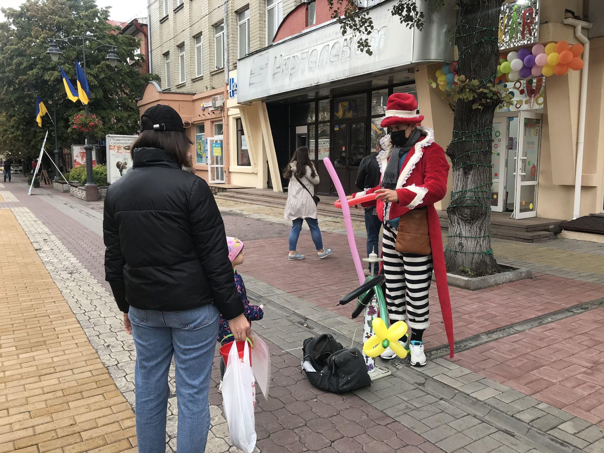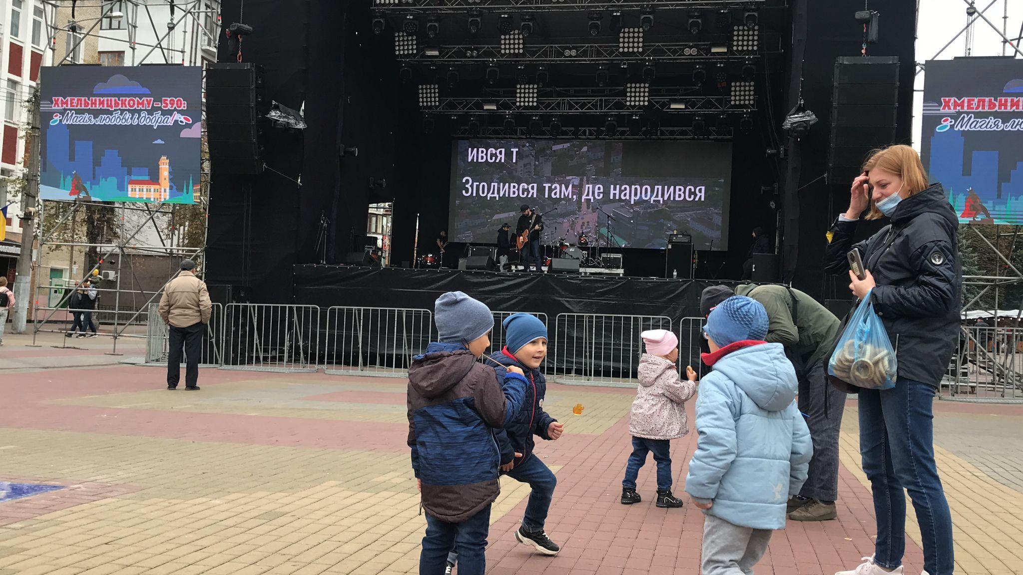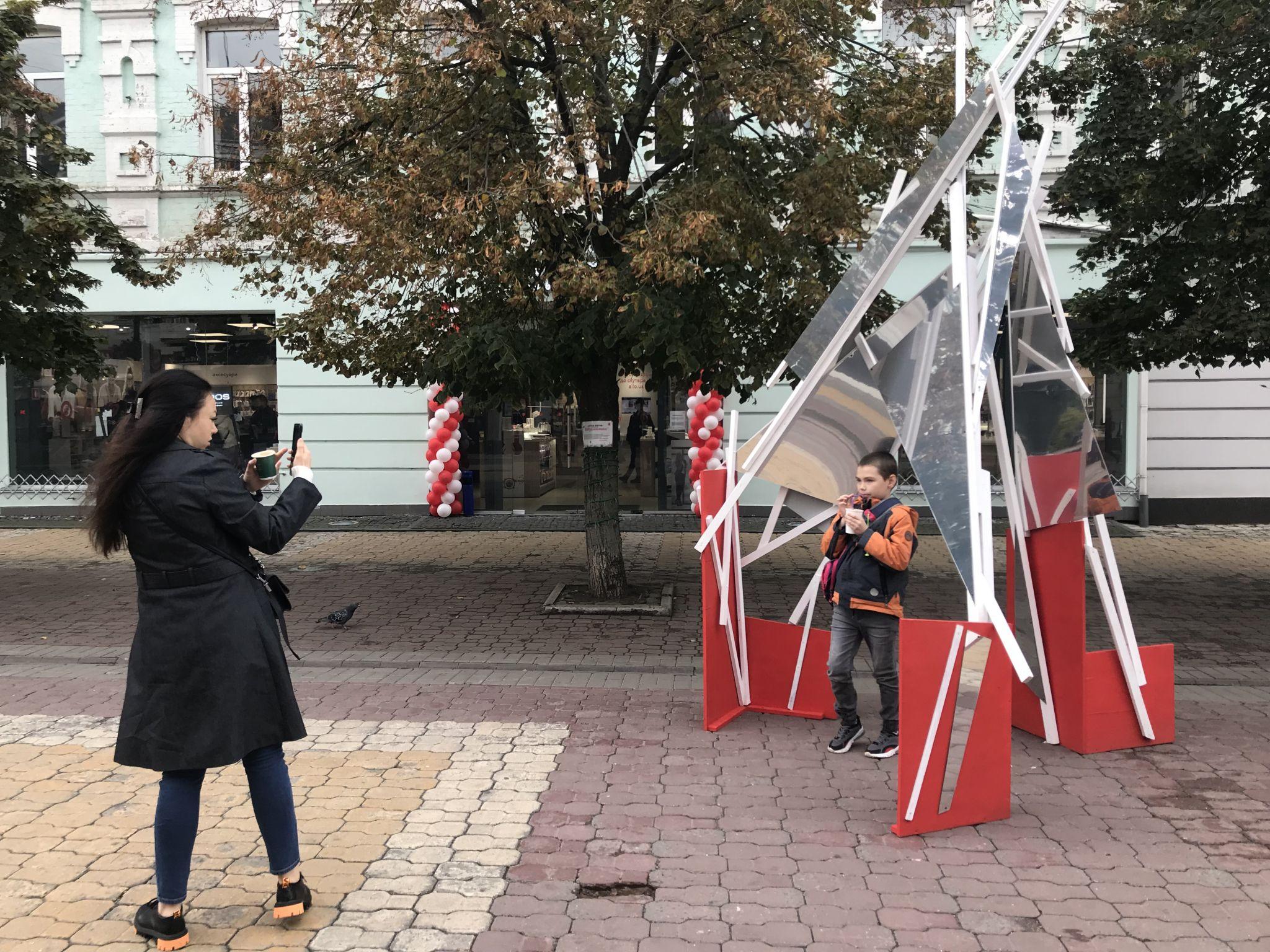 Проскурівська або як кажуть хмельничани «стометрівка» потопає у святкових заходах. В центрі міста встановили дві сцени - біля Дитячого світу та кінотеатру Шевченка. Музику, галас та натовп людей, помітно ще від початку Проскурівської. Саме там хмельничан зустрічають інсталяції та виставки київського художника Антона Логова. Роботи якого вже не вперше демонструють містянам. Біля фігур активно фотографуються й роблять селфі. Позують переважно жінки та діти. Ну а більшість чоловіків покірно виконують роль фотографа.